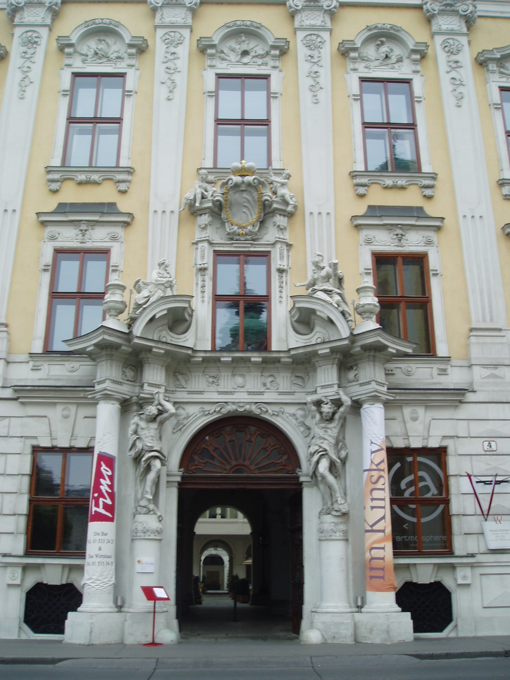 Nyilvános 1570 | 3605 | Rövid leírás | Teljes leírás (1.76 KB) | Freyung 4. Kinsky-palota A Kinsky hercegi család városi palotáját 1713-16 között a bécsi barokk építészet Fischer von Erlach mellett másik legkiválóbb mestere, Johann Lucas von Hildebrandt építette át eredetileg annak a Daun grófnak a megbízásából, akinek a fia, Leopold Joseph Daum Mária Terézia egyik hadvezére lett Monumentális szobrok állnak a bejárat két oldalán és a bejárat felett; hasonló méretűek emelkednek magasba a harmadik emeletet szegélyező tetőpárkányon. Ha áthaladunk a bejárati kupolacsarnokon, két nagy belső udvar tárul fe előttünk. Az első udvart a palota barokk szárnyépületei állják körül. A hátsó udvart a palota még későbbi, már klasszicista stílusban emelt szárnyépületei szegélyezik. A lépcsőház a legszebbek egyike Bécsben. Az előcsarnok ovális boltozata fölött az első emeleten ovális alaprajzú a díszterem is, mennyezetén Carlo Carlone freskójával. Az első emeleti szalon mennyezetén négy kör alakú festményt helyeztek el, amelyek a művészetek szimbólumait jelenítik meg. Amikor Kinsky Ferdinand herceg volt e palota ura, Beethoven zenetanárként kezdett bejáratos lenni a házhoz; később a fényes estélyek vendégeit zongoravirtuózként és saját szerzeményei előadójaként is megnyerte művészetének. Midőn 1809-ben azzal a gondolattal foglalkozott, hogy elhagyja Bécset és Kasselbe megy, Kinsky herceg kezdeményezésére Rudolf főherceg és Lobkowitz herceg közösen életjáradékot biztosítottak a művésznek (ezen belül Kinsky adta a nagyobb összeget); a herceg feleségének, akiről Beethoven azt mondta, hogy „Bécs legcsinosabb és legkövérebb asszonya”, három, Goethe-versekre írt dalát ajánlotta a mester. |