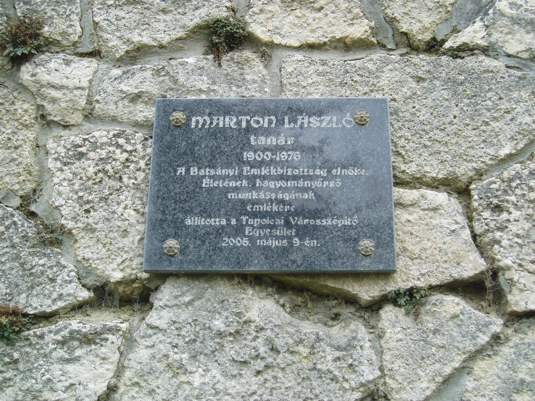 Nyilvános 855 | 1513 | Tapolca, Városi Panteonfal: Marton László emléktáblája | A Malom–tó mögött álló magas kőfal a Városi Panteonfal, amelyen több neves, tapolcai kötődésű személyiségnek állítottak emléktáblát. Marton László (1900-1976) tanár a Batsányi Emlékbizottság elnökeként sokat tett a nagy költő emlékének ápolásáért. A felvétel 2007 februárjában készült. Felh. irod.: Bándi László: Emlékhelyek Veszprém megyében. Veszprém, 1996 www.tapolca.hu |