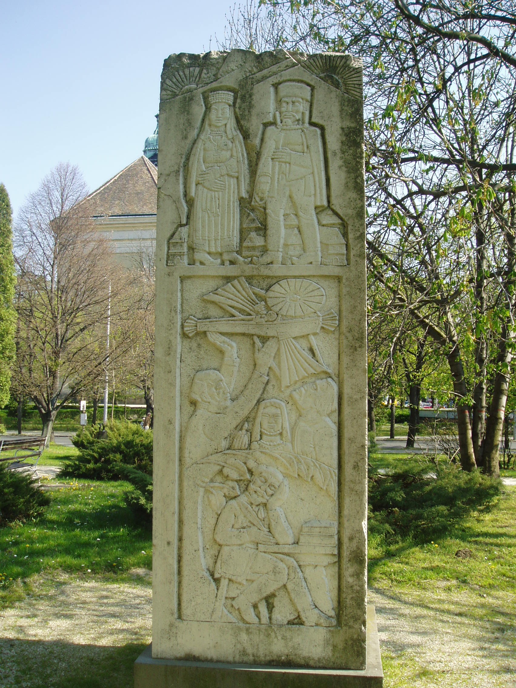 Nyilvános 891 | 1490 | Pápa, Fő tér 1-3. Jókai-oszlop | Az Esterházy kastély előtti, a Fő tér felé néző parkban két egykori pápai diák - Jókai Mór és Petőfi Sándor - emlékére állított szoborkompozíció áll. Jókai Mór emlékoszlopa Szervátiusz Jenő és Szervátiusz Tibor alkotása. A négyzetes hasáb alakú mű felületét Jókai Mór és regényalakjainak domborműves ábrázolásai borítják. A fénykép 2007 áprilisában készült. Felh. irod.: Németh Adél - Szabó Lajos: Pápa. Bp. Panoráma, 1989 |