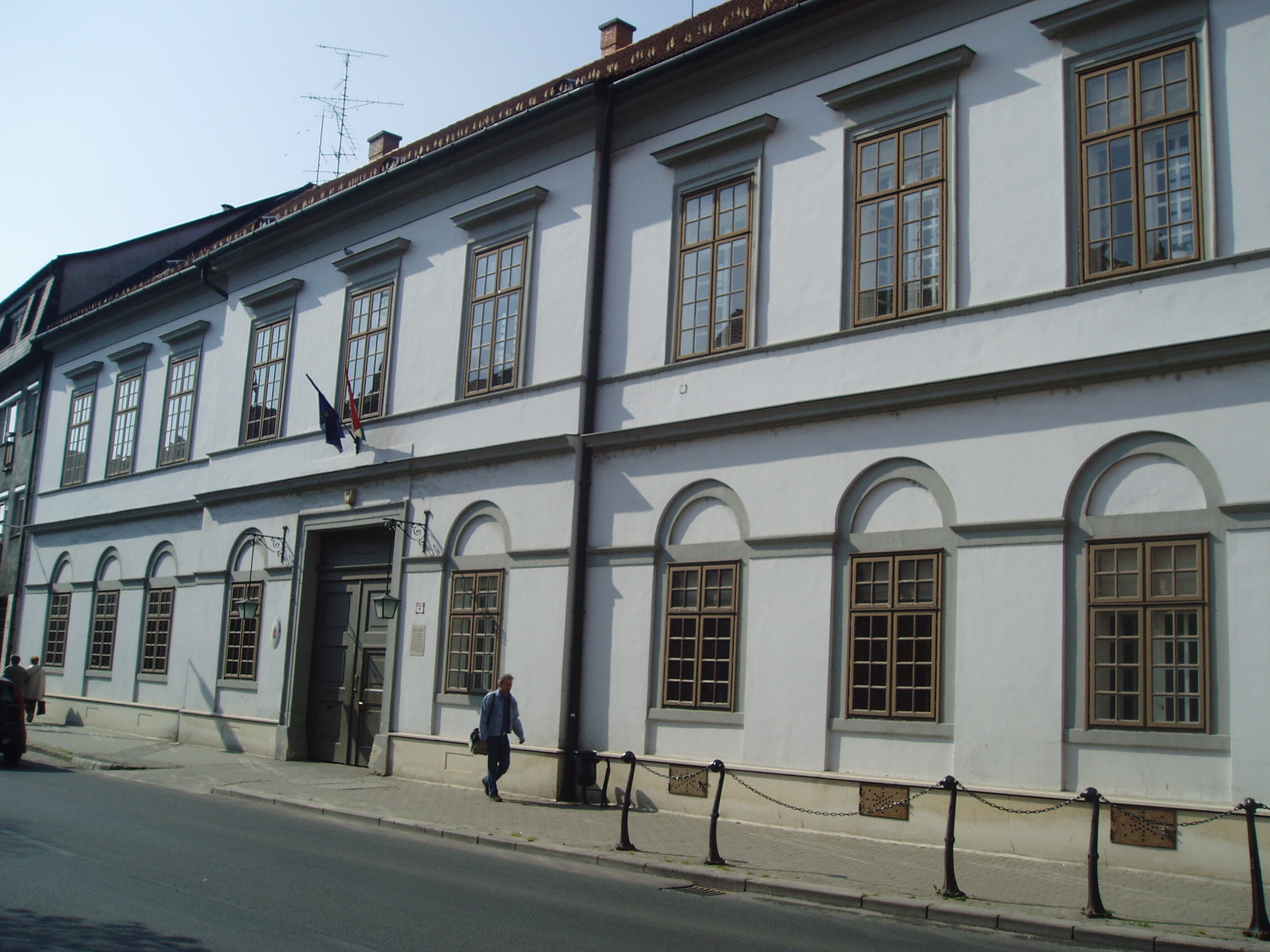 Nyilvános 928 | 1764 | Pápa, Fő utca 17. Régi Megyeháza | A két utcára néző egyemeletes középületet 1824-ben építették klasszicista stílusban. 1732-ig Veszprém vármegyének nem volt hivatalos központja, s a megyegyűléseket elsősorban Pápán és Veszprémben tartották. 1732-ben Veszprémben felépítették a megyeházát a püspök által ajándékozott telken. Pápa azonban, ragaszkodván ősi jogaihoz, 1824-ben szintén épített egy megyeházát. Az épülethez jeles irodalmi emlék is fűződik: a pápai kollégium (lásd: Pápa, Petőfi u. 13.) önképzőköre 1842. június 30-án itt tartotta egyik ünnepi összejövetelét, amelyen részt vett Petőfi Sándor és Jókai Mór is. Petőfi - akkor még Petrovics Sándor az 1841/42-es tanévben a pápai református kollégium diákja volt. Szorosan vett iskolai tanulmányai mellett pályájára döntő hatással volt az iskola önképzőkörének - Képzőtársaságának - tevékenysége, amelyben az ugyancsak Pápán diákoskodó Jókaival, Orlai Petrich Somával és más jeles diákokkal vett részt. Az 1842. június 30-i ünnepségen az arra érdemesített diákok saját verseikkel, elbeszéléseikkel, szavalatokkal mutatkoztak be a város közönségének. Eszterházy Károly, Pápa ura pénzjutalmat is kitűzött a legjobb teljesítmények jutalmazására. Ez alkalommal Petőfi két verse is elhangzott diáktársai tolmácsolásában: Lehel című balladája, illetve a Szín és való (lásd még: Pápa, Fő tér 15.) című verse. Ő maga viszont más költőktől szavalt (akkoriban még színész szeretett volna lenni). Különösen nagy sikert aratott egy korabeli divatos verssel, Szalkay Máté: Ólmos botok című költeményével. Kölcsönkért jelmezben - lobogós ingben, pitykés nadrágban, kezében fütyköst forgatva - remekül eljátszotta a maradi korteseket parodizáló verset. Lehel című balladájával két arany pályadíjat nyert, s a jelen lévő Eszterházy grófnak annyira tetszett az Ólmos botok előadása, hogy jutalmát megtoldotta még egy arannyal. A műsoron Jókai is jelen volt, neki két elbeszéléséből olvastak fel diáktársai részleteket. A fénykép 2007 áprilisában készült. Felh. irod.: Németh Adél - Szabó Lajos: Pápa. Bp. Panoráma, 1989 "A kényes úrfi s a rongyos baka". Tanulmányok két halhatatlan pápai diákról. Pápa, Pápai Református Gyűjtemények, 2001 |