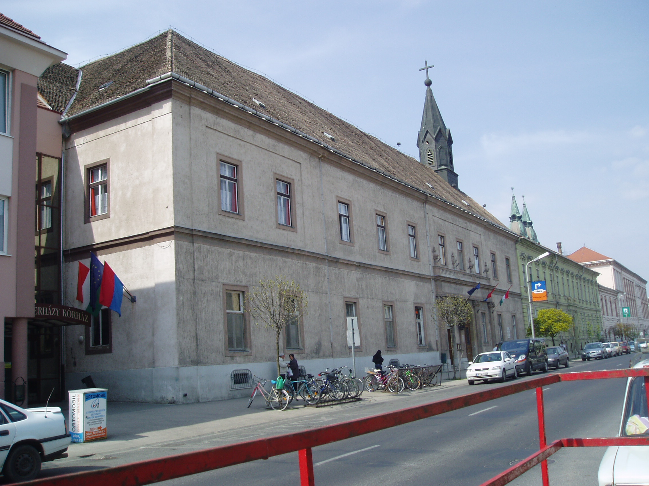 Nyilvános 868 | 1404 | Pápa, Jókai utca 7. | A kórház régi épülete 1763-1768 között készült el Fellner Jakab tervei alapján. Az irgalmas rendet 1730 körül gróf Esterházy Ferenc telepítette le Pápán az akkor gyakori pestises betegek ápolására. Első kórházuk is ezen a helyen volt, melynek céljára a Zöldfa vendéglőt alakították át. A mai kórházat 1757-ben alapította Eszterházy Károly, Pápa ura, akkor váci, majd egri püspök (lásd még: Pápa, Jókai u. 9.). A Fellner Jakab által épített, azóta kibővített és átalakított épület egyemeletes, szárnyai négyszögű udvart vesznek körül. A ma is látható torony az egykori kórházkápolnához tartozott. A főbejárattól balra található az 1757-ben alapított patika, amely ma múzeum, illetve magángyógyszertárként ma is működik. Belső terét csehsüvegboltozat fedi. Az ajtót keretező provinciális jellegű festmények 1782-ben készültek. Védetté nyilvánított berendezése művészi értéket képvisel. A fénykép 2007 áprilisában készült. Felh. irod.: Németh Adél - Szabó Lajos: Pápa. Bp. Panoráma, 1989 |