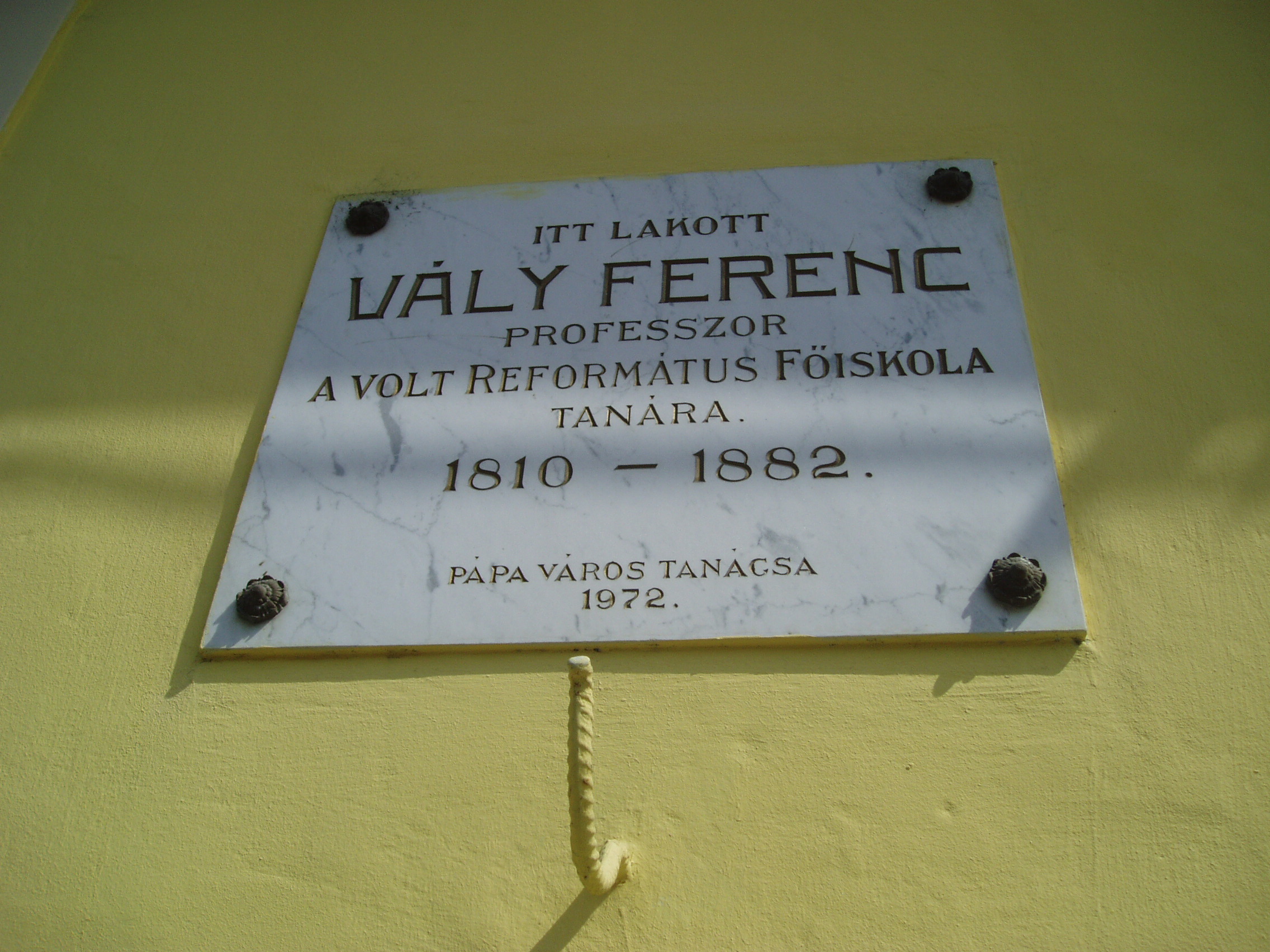 Nyilvános 928 | 1514 | Pápa, Jókai utca 20. | Ez a kis ház volt Vály Ferenc főiskolai professzor lakóháza pápai évei alatt. Vály Ferenc (Magyarsiófok, 1810. szept. 30. – Pápa, 1882. dec. 13.) tanár, tankönyvíró. 1833-tól néhány évig tanító volt Pápán, de visszakerült Komáromba, ahol 1839-től a református gimnázium igazgatójaként működött. 1839-ben feleségül vette Jókay Esztert, Jókai Mór nővérét. A szabadságharc után, melyben tüzérként vett részt, telepedett le a család Pápán, ahol a református főiskola tanára és a tanítóképző igazgatója volt. Egy természetrajzi és egy kémiai tankönyve jelent meg. 1882-ben hunyt el, a pápai Alsóvárosi temetőben nyugszik (lásd: Pápa, Alsóvárosi temető: Vály Ferenc sírja). Felesége, Jókay Eszter 1816-ban született Komáromban. Számos cikket és visszaemlékezést írt a korabeli folyóiratokba, többek között forrásértékű adatokkal szolgált Jókai Mór gyermekkoráról. 1889. máj. 7-én hunyt el Pápán, férjével közös sírban nyugszik. Leányuk, az ebben a házban (is) nevelkedett Vály Mari Komáromban született 1840. nov. 17.-én. Férjének és gyermekének korai halála után Jókaiékhoz költözött a fővárosba, háztartásuk vezetésében segédkezett. Nagybátyja életét terjedelmes emlékiratban örökítette meg. Pápán hunyt el 1915. május 17-én, sírja szülei nyughelye mellett van (lásd: Pápa, Alsóvárosi temető: Vály Mari sírja). A fénykép 2007 áprilisában készült. Felh. irod.: Németh Adél - Szabó Lajos: Pápa. Bp. Panoráma, 1989 Veszprém megyei életrajzi lexikon. Veszprém, Veszprém Megyei Önkormányzat Közgyűlése, 1998 |