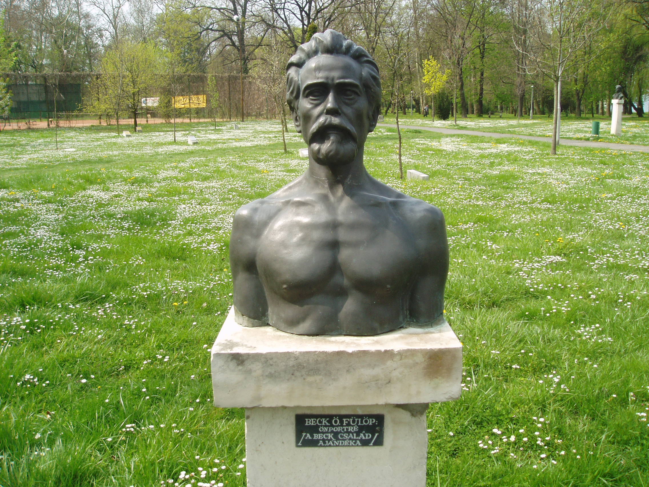 Nyilvános 921 | 2357 | Pápa, Köztársaság liget 1. Beck Ö. Fülöp szobra | Az 1970-es években felépített, Jókai Mórról elnevezett Városi Színház parkjában Pápához kötődő jeles személyiségek mellszobrait állították fel, köztük az 1873-ban Pápán született Beck Ö. Fülöp önportréját, amelyet a Beck család adományozott a városnak. A fénykép 2007 áprilisában készült. |