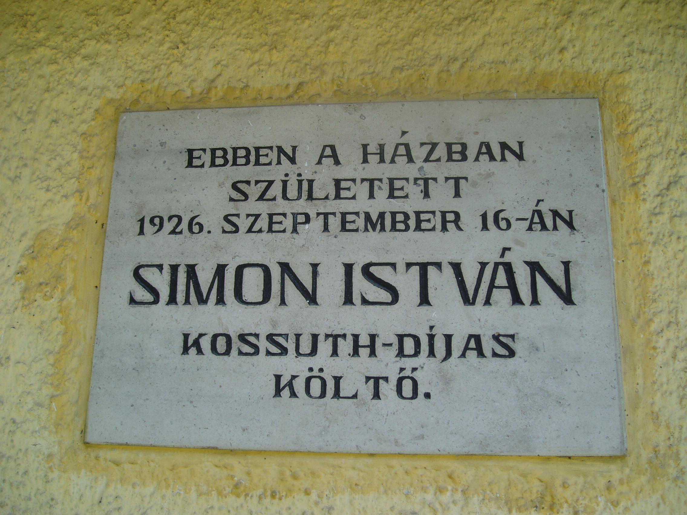 Nyilvános 1322 | 2850 | Rövid leírás | Teljes leírás (1.18 KB) | Bazsi, Fő út 149. 1926. szeptember 16-án itt, az udvari házrészben született Simon István költő. A kis épületet 1983. április 11-én, a költészet napján, országos ünnepség keretében avatták emlékházzá. Benne ma is a költő szüleinek eredeti bútorai és tárgyai láthatók, Simon Istvánról szóló dokumentációval kiegészítve. Simon István tizennyolc éves koráig élt Bazsiban. A sümegi gimnáziumot bejáró diákként végezte el. 1948-tól Budapesten lakott, de gyakran hazajárt szülőfalujába. Számos, ebben a házban készült fényképen látható idős szüleivel a már nagy elismertséget elért költő. 1975 nyarán nagybetegen került a sümegi kórházba, ahol július 6-án elhunyt. Kívánságának megfelelően Bazsiban temették el (sírjánál sajnos nem jártam, a temető elég messze van a falutól - K.K.). A szegényparaszti környezet, a szülőföld, a Sümeg környéki táj mindvégig éltető eleme volt költészetének. A fénykép 2007 júniusában készült. Felh. irod.: Erős Zoltán: Magyar irodalmi helynevek A-tól Z-ig. Bp. Kis-Lant Kiadó, 1995 |