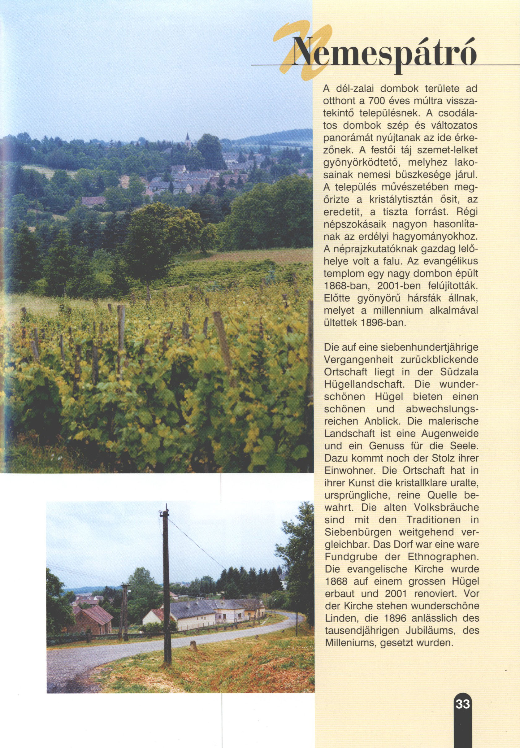 Nyilvános 1875 | 6840 | Nemespátró | Die auf eine siebenhundertjährige Vergangenheit zurückblickende Ortschaft liegt in der Südzala Hügellandschaft. Die wunderschönen Hügel bieten einen schönen und abwechslungsreichen Anblick. Die malerische Landschaft ist eine Augenweide und ein Genuss für die Seele. Dazu kommt noch der Stolz ihrer Einwohner. Die Ortschaft hat in ihrer Kunst die kristallklare uralte, ursprüngliche, reine Quelle bewahrt. Die alten Volksbräuche sind mit den Traditionen in Siebenbürgen weitgehend vergleichbar. Das Dorf war eine wahre Fundgrube der Ethnographen. Die evangelische Kirche wurde 1868 auf einem grossen Hügel erbaut und 2001 renoviert. Vor der Kirche stehen wunderschöne Linden, die 1896 anlässlich des tausendjährigen Jubiläums, des Milleniums, gesetzt wurden. Dieses Text stammt von: Titel: Hívogató a Régiók Kapujában - Útikönyv Látnivalók Nagykanizsán és Térségében (Einladend in dem Tor des Gebiets - Reisebuch - Sehenswürdigkeiten in Nagykanizsa und Umgebung) Herausgegeben von: Nagykanizsa és a Környező Települések Területfejlesztési Társulása (Verein für Gebietsentwicklung in Nagykanizsa und in ihrer Umgebung) 8800 Nagykanizsa, Petőfi Sándor út 5. Tel.: 06 93/536-453 • 06 93/536-454 Tel ./Fax: 06 93/326-323 E-mail: terstars@axelero.hu www.kanizsaterseg.celodin.hu |