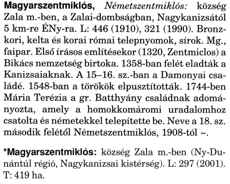 Nyilvános 2463 | 6568 | A szócikkek felismertetett szövege: | (A csillag után a kiegészítő kötetből származó szöveg következik) Magyarszentmiklós, Németszentmiklós: község Zala m.-ben, a Zalai-dombságban, Nagykanizsától 5 km-re ÉNy-ra. L: 446 (1910), 321 (1990). Bronzkori, kelta és korai római telepnyomok, sírok. Mg., faipar. Első írásos említésekor (1320, Zentmiclos) a Bikács nemzetség birtoka. 1358-ban felét eladták a Kanizsaiaknak. A 15–16. sz.-ban a Damonyai családé. 1548-ban a törökök elpusztították. 1744-ben Mária Terézia a gr. Batthyány családnak adományozta, amely a homokkomáromi uradalomhoz csatolta és németekkel telepítette be. Neve a 18. sz. második felétől Németszentmiklós, 1908-tól ~. *Magyarszentmiklós: község Zala m.-ben (Ny-Du-nántúl régió, Nagykanizsai kistérség). L: 297 (2001). T: 419 ha. A szócikkek a következő lexikonból származnak: Cím: Magyar nagylexikon Közreműködő: Élesztős László (1949) (szerk.) ; Barabás Éva (1943) (szerk.) ; Berényi Gábor (1946) (szerk.) ; Bárány Lászlóné (szerk.) ; Adelmann-né Kertész Judit (1945) (közrem.) ; Froemel Károlyné Jáky Éva (1936) (közrem.) ; Akadémiai Kiadó és Nyomda Vállala Szerz. közl.: [... Élesztős László főszerk.] ; [szerk. Barabás Éva et al.] ; [bibliogr. Adelmanné Kertész Judit] ; [kész. az Akadémiai Kiadó Magyar Nagylexikon Szerkesztőségében] Kiadás: Budapest : Akad. K., 1993- Kötetei: 1. köt., A - Anc 2. köt., And - Bag 3. köt., Bah - Bij 4. köt., Bik - Bz 5. köt., C - Csem 6. köt., Csen - Ec 7. köt., Ed - Fe 8. köt., Ff - Gyep 9. köt., Gyer - Iq 10. köt., Ir - Kip 11. köt., Kir - Lem 12. köt., Len - Mep 13. köt., Mer - Nyk 14. köt., Nyl - Pom 15. köt., Pon - Sek 16. köt., Sel - Szö 17. köt., Szp - Ung 18. köt., Unh - Z 19. köt., Kiegészítő kötet, A - Z ETO jelzet: 030=945.11 Szakjelzet: 030 Cutter: M 14 ISBN: 963-05-6611-7 [!ISBN 963-05-6615-X] Nyelv: magyar Megjegyzés: Az 5. kötettől kiad. a Magyar Nagylexikon Kiadó ; A 6. kötettől főszerk. Berényi Gábor ; A 6. kötettől szakszerk. Bárány Lászlóné et al. ; A 6. kötettől bibliogr. Froemel Károlyné ; Bibliogr. a szócikkek végén |