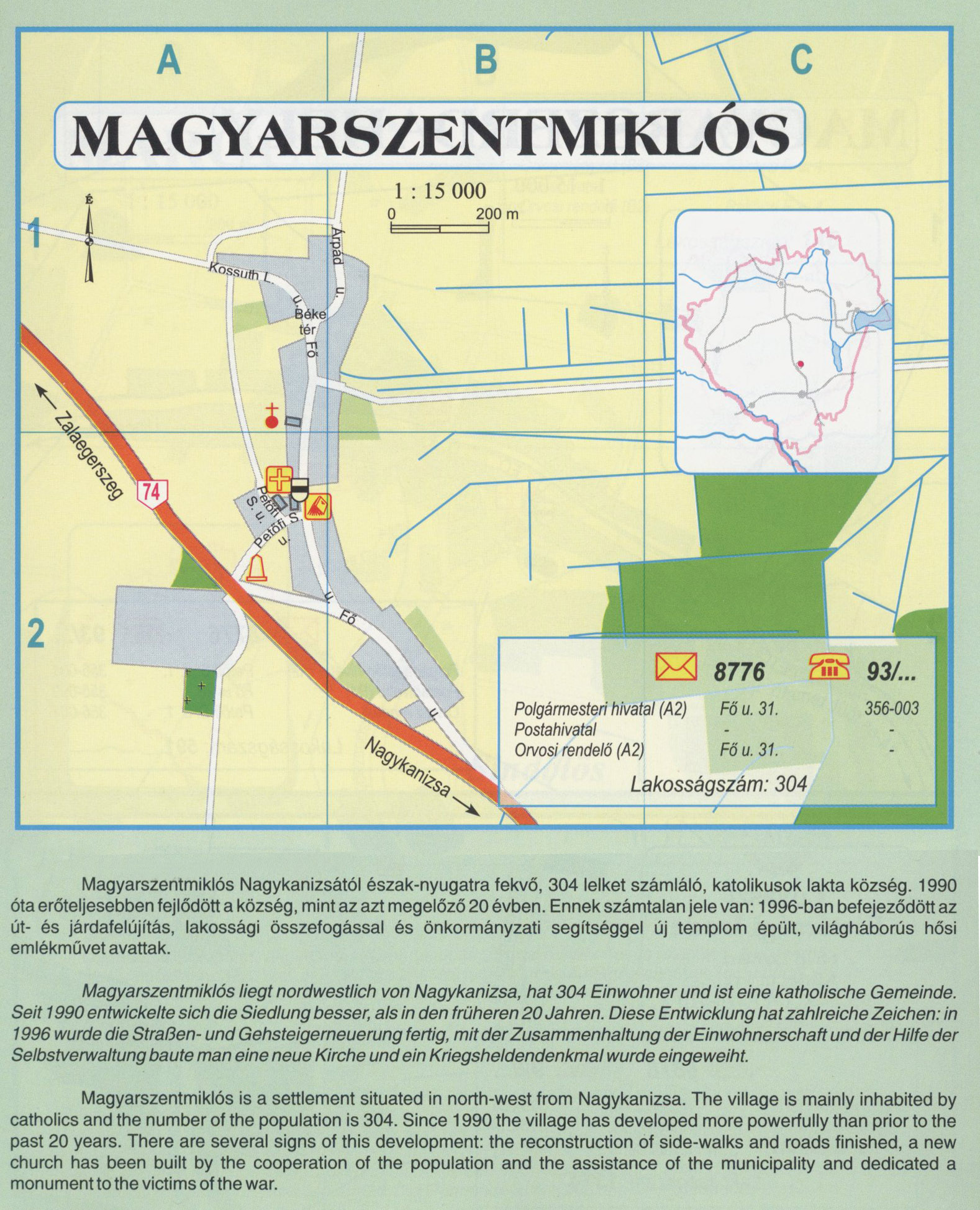 Nyilvános 2543 | 9599 | MAGYARSZENTMIKLÓS | Magyarszentmiklós Nagykanizsától észak-nyugatra fekvő, 304 lelket számláló, katolikusok lakta község. 1990 óta erőteljesebben fejlődött a község, mint az azt megelőző 20 évben. Ennek számtalan jele van: 1996-ban befejeződött az út- és járdafelújítás, lakossági összefogással és önkormányzati segítséggel új templom épült, világháborús hősi emlékművet avattak. Magyarszentmiklós liegt nordwestlich von Nagykanizsa, hat 304 Einwohner und ist eine katholische Gemeinde. Seit 1990 entwickelte sich die Siedlung besser, als in den früheren 20 Jahren. Diese Entwicklung hat zahlreiche Zeichen: in 1996 wurde die Straßen- und Gehsteigerneuerung fertig, mit der Zusammenhaltung der Einwohnerschaft und der Hilfe der Selbstverwaltung baute man eine neue Kirche und ein Kriegsheldendenkmal wurde eingeweiht. Magyarszentmiklós is a settlement situated in north-west from Nagykanizsa. The village is mainly inhabited by catholics and the number of the population is 304. Since 1990 the village has developed more powerfully than prior to the past 20 years. There are several signs of this development: the reconstruction of side-walks and roads finished, a new church has been built by the cooperation of the population and the assistance of the municipality and dedicated a monument to the victims of the war. A részlet a következő kiadványból származik/Die Teile stammen vom volgenden Buch/This text came from the following book: Cím/Titel/Title: Zala megye településeinek atlasza - 257 település részletes térképe/Atlas der Komitat Zala - 257 Detailte Siedlungskarten/Zala county\'s Atlas - 257 settlement maps. Közreműködő/contributor: Lackner László (1943) (fotó) Kiadás/Ausgabe/Publisher: Gyula : HISZI-MAP, 1997 Sorozat/Serie/Series: Indulástól - megérkezésig... ETO: 912(439.121-2) ; 908.439.121 Cutter: Z 19 ISBN: 963-610-025-4 Oldalszám/Seiten/Pages: 323, 81 p. Megjegyzés/Note: Lezárva/Abgeschlossen am/Closed am: 1997. máj. 30. |