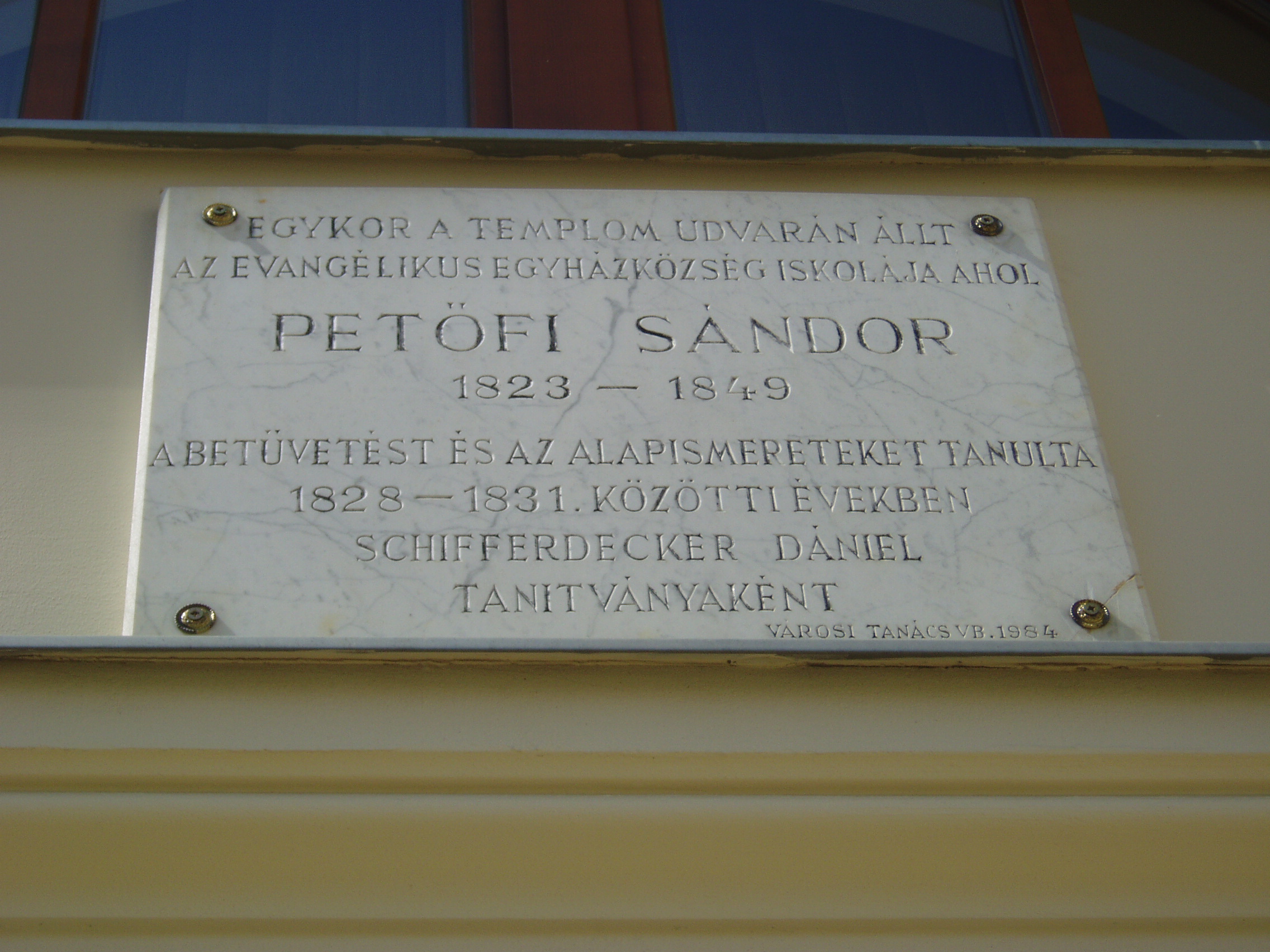 Nyilvános 1272 | 2417 | Kecskemét, Arany János utca 1. | Az Ybl Miklós által tervezett evangélikus templom mellett áll az Evangélikus Egyház Lelkészi Hivatalának épülete. Rajta márványtábla idézi Petőfi Sándor emlékét, aki itt, az egykor ezen a helyen állott elemi iskolában tanult kisiskolás korában. Egy másik, ugyanerre vonatkozó emléktáblát a közelben álló Szabadság tér 3. számú épületen is elhelyeztek. A fénykép 2006 augusztusában készült. Felh. irod.: Heltai Nándor: Kecskemét. Kecskeméti Lapok, 1998 |