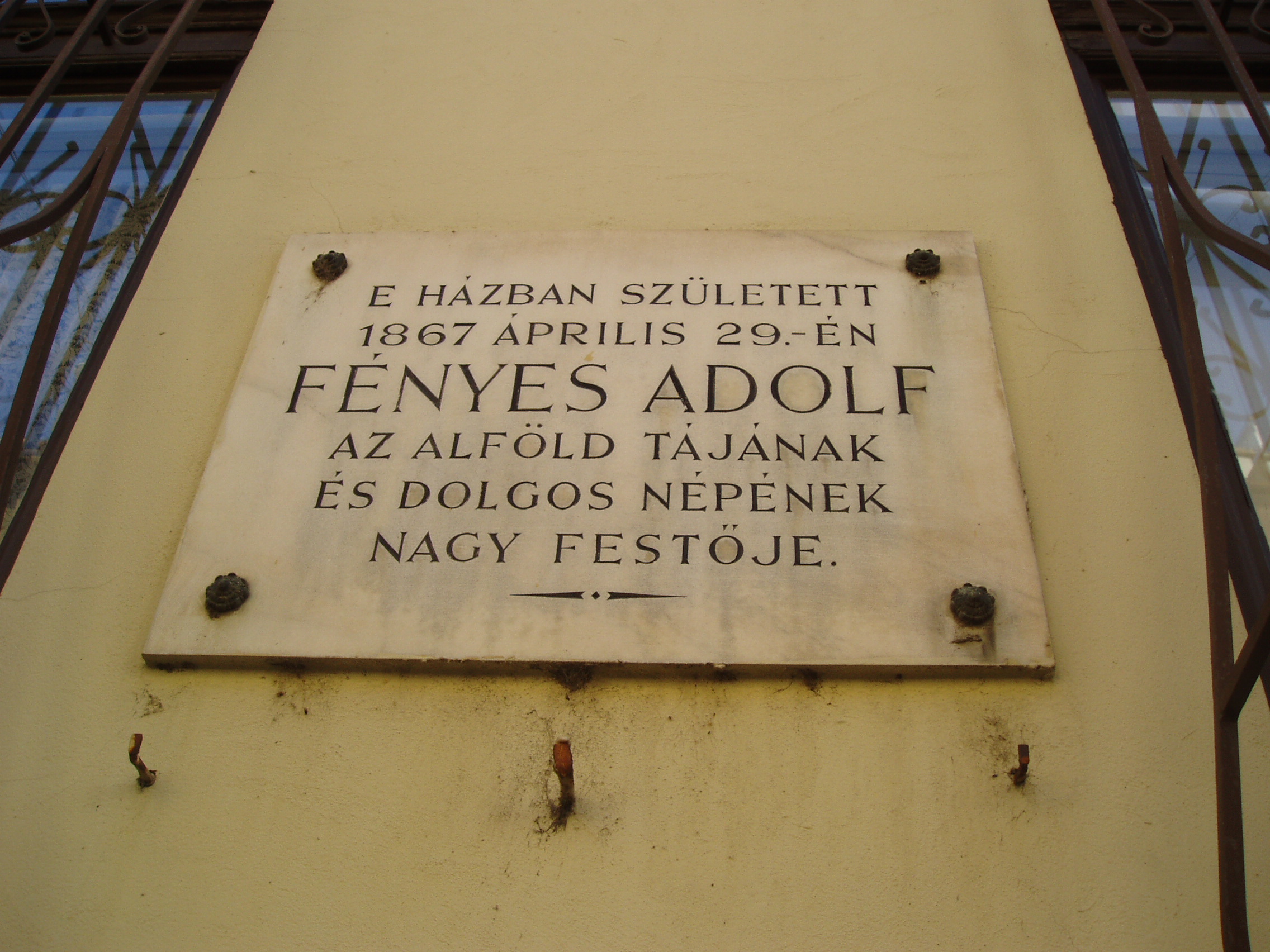 Nyilvános 972 | 1656 | Kecskemét, Wesselényi utca 6. | Az emeletes városi házon olvasható emléktábla szerint itt született 1867. április 29-én Fényes Adolf. Heltai Nándor, kecskemét történetének kutatója szerint a tábla szövege pontatlan, mert a festőművész nem ebben a házban, hanem a helyén állott korábbi épületben született. Szerinte ez a ház Moór Emánuel zongoraművész és feltaláló szülőháza. Ő viszont Fényes Adolfnál néhány évvel korábban, 1863-ban született, tehát - ha Heltai információja helyes - ő sem ebben a házban, hanem az elődében látta meg a napvilágot. A fénykép 2006 augusztusában készült. Felh. irod.: Heltai Nándor: Kecskemét. Kecskeméti Lapo, 1998 |