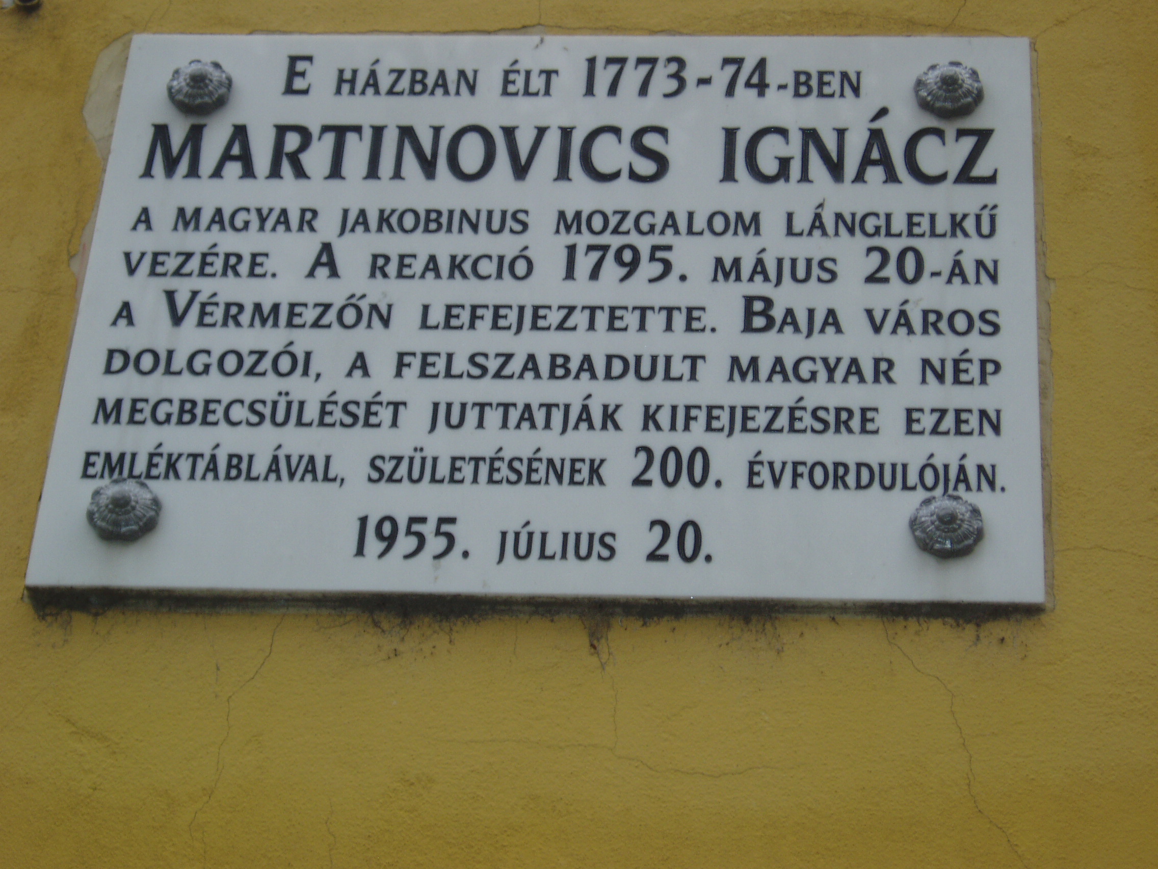 Nyilvános 1433 | 3435 | Baja, Bartók Béla utca 1-3. Páduai Szent Antal ferences kolostortemplom és rendház - Martinovics Ignác emléktáblája | Baja központjában áll az egykori ferences rendház, s hozzá tapadva a kolostortemplom, más néven Barátok temploma. Baján már a XIII. századtól jelen voltak a ferencesek. A szerzetesrend a török kiűzése után, a XVII. század végén tért vissza, köztük jónéhány bosnyák származású szerzetes is volt. A település régi templomának helyén először rendházukat építették fel, alapkövét 1722-ben rakták le. Az épület eredetileg barokk stílusú volt, azonban az átépítések miatt ez külső képén kevéssé látszik. Némileg megmaradt udvarának és folyosóinak barokk kiképzése. 1772/73-ben e falak között élt és tanult Martinovics József, s itt tett szerzetesi fogadalmat 1773. április 24-én (emléktáblája egy évvel későbbi évszámokat említ). A barokk stílusú templomot 1730 körül kezdték építeni, majd 1780-ban átalakították. Mai arculatát 1930 körül nyerte el, tornyát 1902-ben építették újjá. A szoborkert felé néző Mater Dolorosa szobor Baja legrégibb ismert barokk alkotása, 1740-ből származik. A templom oldalánál lévő parkban állították fel a bajai születésű feltaláló, Kliegl József (lásd: Baja, Dózsa Gy. u. 18.) emlékművét, amelyet ükunokája, Kliegl Sándor szobrászművész készített. A fénykép 2007 októberében készült. Felh. irod.: Látnivalók Bács-Kiskun megyében. Miskolc, Well-PRess, 2002 www.szentantal.baja.hu www.wikipedia.org |