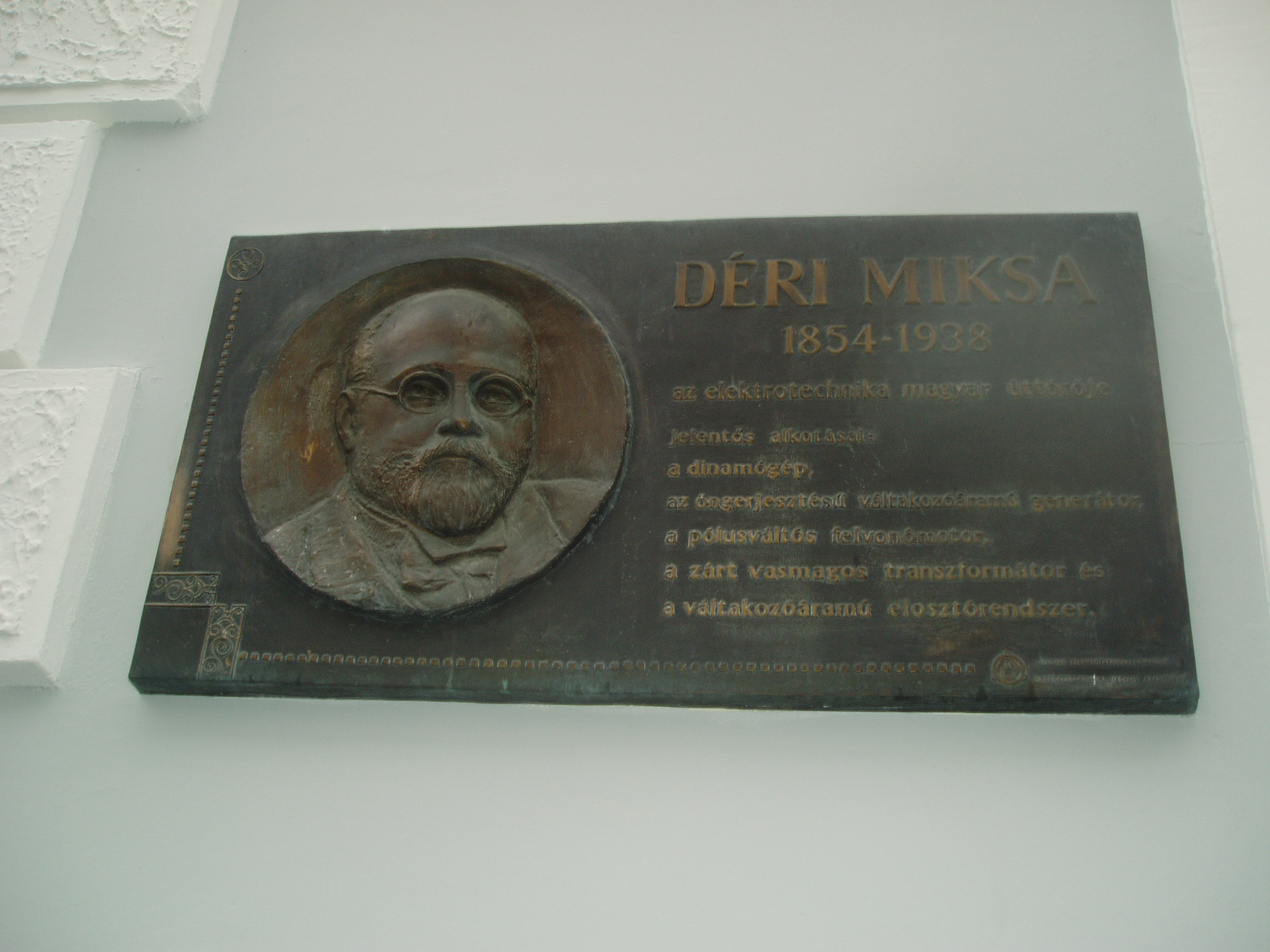 Nyilvános 1489 | 2269 | Baja, Déri Miksa köz: Déri Miksa emléktáblája | A róla elnevezett kis belvárosi közre néző épület falán elhelyezték a névadó emléktábláját. Déri Miksa (1854-1938) a korszerű elektrotechnika elméleti és gyakorlati megalapozója, a transzformátor egyik felfedezője volt. Az egykori Bács-Bodrog megye déli részén fekvő Bács községben született gazdag kereskedőcsalád sarjaként. Testvére volt Déri Frigyes (lásd: Baja, Déri kert) és Déri Kálmán festőművész. A bajai cisztercita gimnáziumba (lásd: Baja, Szent Imre tér 5.) járt, műszaki tanulmányait a budapesti József Műegyetem mérnöki szakosztályán kezdte el, vízépítő-mérnöki oklevelet 1877-ben szerzett a Bécsi Műegyetemen. Először folyamszabályozási munkákban vett részt a fővárosban és Szegeden, de már ekkor foglalkoztatta a villamosság. Zipernowsky Károly - akivel még az első elektrotechnikai próbálkozások idején ismeretséget kötött - 1882-ben munkatársul fogadta és Déri belépett a Ganz gyár Elektromos Osztályára. Közös munkájuk első eredménye az öngerjesztésű váltakozó áramú generátor volt. Déri 1883-tól kezdve Bécsben dolgozott a gyár ausztriai képviselőjeként, de a kutatói munkát Zipernowskyval továbbra is rendszeresen folytatták. Kiváló munkatársat kaptak Bláthy Ottó személyében, aki szintén a Ganznál dolgozott gépszerkesztőként. Nagyrészt a három feltalálónak köszönhetően a Ganz gyár néhány éven belül tekintélyes, nemzetközi jelentőségű vállalattá fejlődött. Bláthy ötletére 1885-ben megalkották a zárt vasmagú transzformátort, amelynek megalkotásában Déri a kísérleti munka oroszlánrészét végezte. Szabadalmukat Zipernowsky-Déri-Bláthy (ZBD) transzformátor néven ismerte meg a világ. 1889-től Déri az akkor alapított bécsi Internationale Électricitäts Gesellschaft vezető igazgatója lett, még ebben az évben megszervezte és berendezte a bécsi villamos-erőművet. Bécs város villamos világításának koncesszióját a bécsi Union Bank és a Ganz-gyár nyerték el, e két vállalat alapította az I.E.G. vállalatot, amelynek Déri 1896-ig volt igazgatója. A vállalat az első olyan vállalkozás volt Európában, amely kizárólag villamos erőművek létesítésének pénzügyi szolgáltatása céljából alakult meg. Néhány év alatt 60 Monarchia-beli transzformátor telep kiépítésében vett részt. Déri Miksa számos egyéni, valamint Zipernowskyval és Bláthyval közösen kifejlesztett találmányt is magáénak mondhat. 1898 és 1902 között kidolgozta kompenzált egyenáramú gépét, majd 1903-1904-ben kifejlesztette a kétkefe-rendszerű egyfázisú repulziós motorát, amelyet a világirodalom Déri-motor néven ismer. 1938. március 5-én hunyt el 84 éves korában Merano-ban, ahol nyugalomba vonulva élt. A fénykép 2007 októberében készült. Felh. irod.: www.industrianet.hu/UserFiles/ehsz/Deri_Miksa.htm |