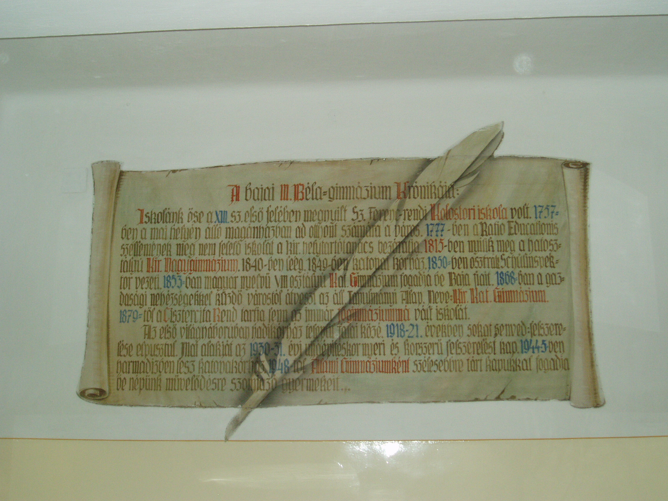 Nyilvános 1026 | 1446 | Baja, Szent Imre tér 5. III. Béla Gimnázium | A gimnázium krónikájának összefoglalása az előcsarnok falán. Az 1757-ben alapított iskola mai épületét 1815-ben emelték, majd 1892-ben és 1931-ben jelentősen bővítették, alakították. Korábban a közelben ma is álló ferences kolostorban (lásd: Baja, Bartók B. u. 1-3.) folyt a tanítás. Az intézmény a ferencesek után 1879-től a ciszterci rendé lett. III. Béla nevét, aki a ciszter rendet letelepítette Magyarországon, az 1921/22-es tanévben vette fel. Ma már szobra is ott áll az épület előtt. 1948 óta állami iskola. Híres növendéke volt Nagy Ignác író (1819–1821), Türr István (1835–1840), Tóth Kálmán költő (1839–1845), Szarvas Gábor nyelvész (1842–1848). Pályakezdőként az 1905/06-os tanévben itt tanított Babits Mihály. Az iskolának a zenei életben nevet szerzett diákjai is voltak. Ide járt gimnáziumba az 1902/03-as tanévtől nyolc éven át a bajai születésű Kun Imre (1892–1977), a legendás hangversenyrendező és az 1940-es évek elején a szintén Baján született Lukin László (1926–2004) zenepedagógus, karnagy. A fénykép 2007 októberében készült. Felh. irod.: Bálint László: A bajai III. Béla Gimnázium. Bp. Tankönyvkiadó, 1989 |