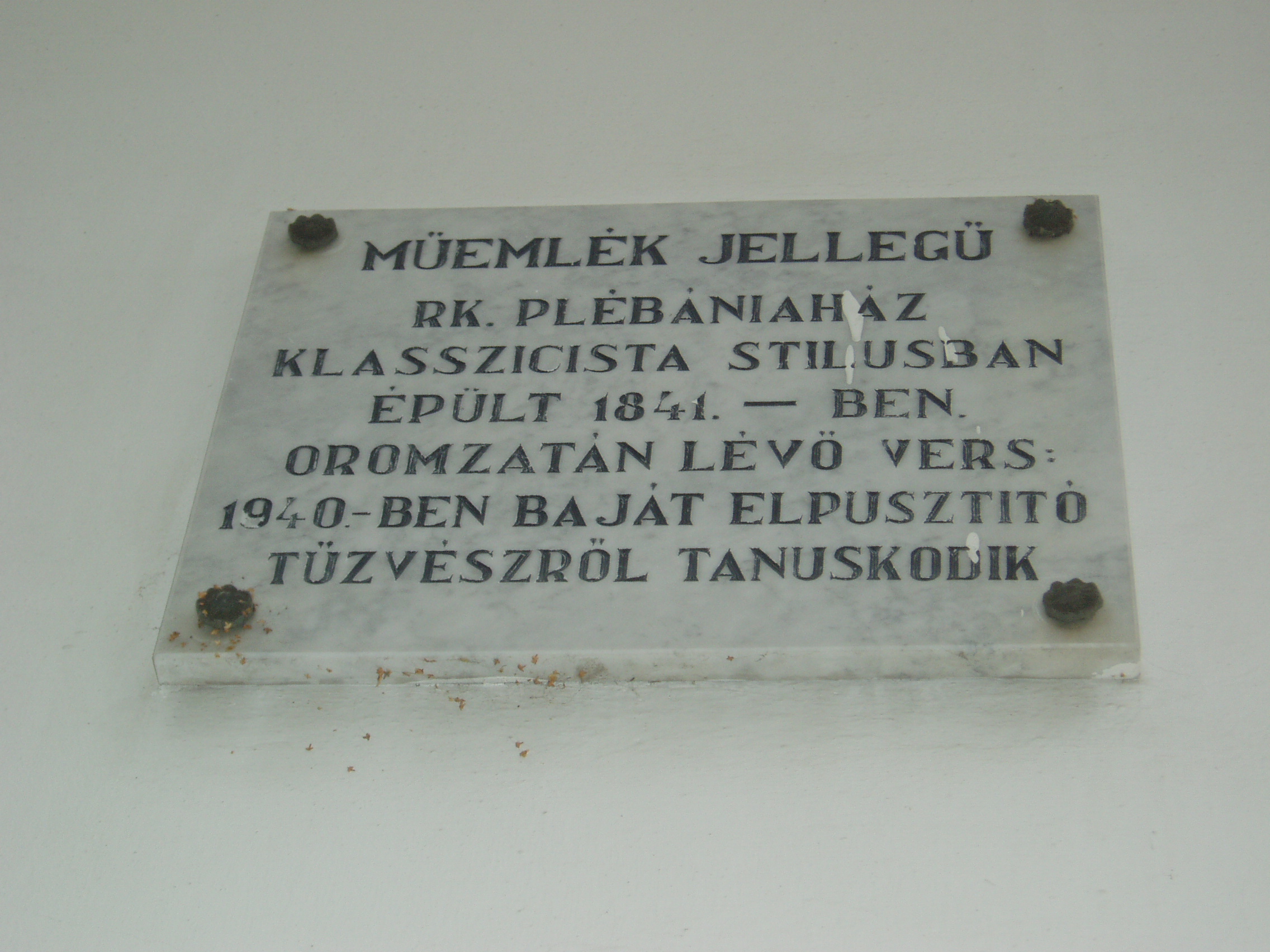 Nyilvános 1020 | 1442 | Baja, Szent Imre tér 6. R. k. plébániaház | A műemlék jellegű római katolikus plébániaház klasszicista stílusban épült újjá 1841-ben. Az oromzatán olvasható kronosztikonon a várost porig égető 1840. május 1-jei tűzvész napját örökítették meg. A tűzvész során elpusztult 1282 lakóház, 812 melléképület, 5 templom, a zsinagóga és a kórház, s 46 ember halt meg a tűzben. 1957 és 1962 között itt élt dr. Belon Gellért (1911-1987) plébános, későbbi pécsi püspök. A fénykép 2007 októberében készült. Felh. irod.: www.vendegvaro.hu |