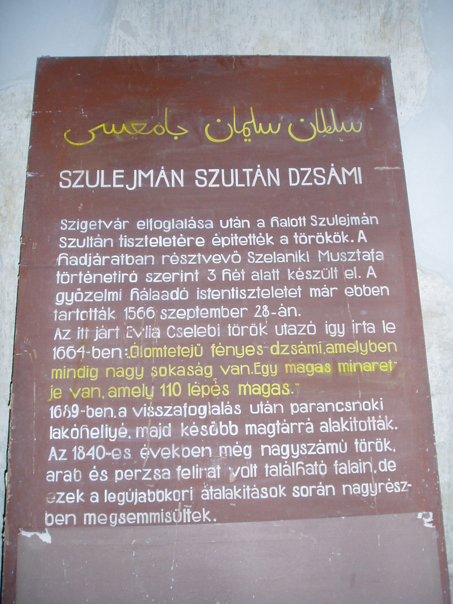 Nyilvános 1539 | 2294 | Szigetvár, Vár: dzsámi | A vár egyik központi épülete a Szulejmán dzsámi, amely a győztes szultán tiszteletére épült a XVI. században. A téglalap alaprajzú dzsámi Mekka felé néző oldalán látható a kőkeretes, egykor csempével borított, szalaktit boltozatú imafülke (mihrab). A dzsámit L alakú folyosó veszi körül, ennek délkeleti oldalán egy másik mihrab fülke található. Északnyugaton csatlakozik a dzsámihoz a szabályos tizennégyszög alakú minaret, amelynek nagy része a XVIII. században leomlott. A fénykép 2005 júniusában készült. Felh. irod.: Török műemlékek Magyarországon. = www.terebess.hu/keletkultinfo/minaret/szigetvar.html |