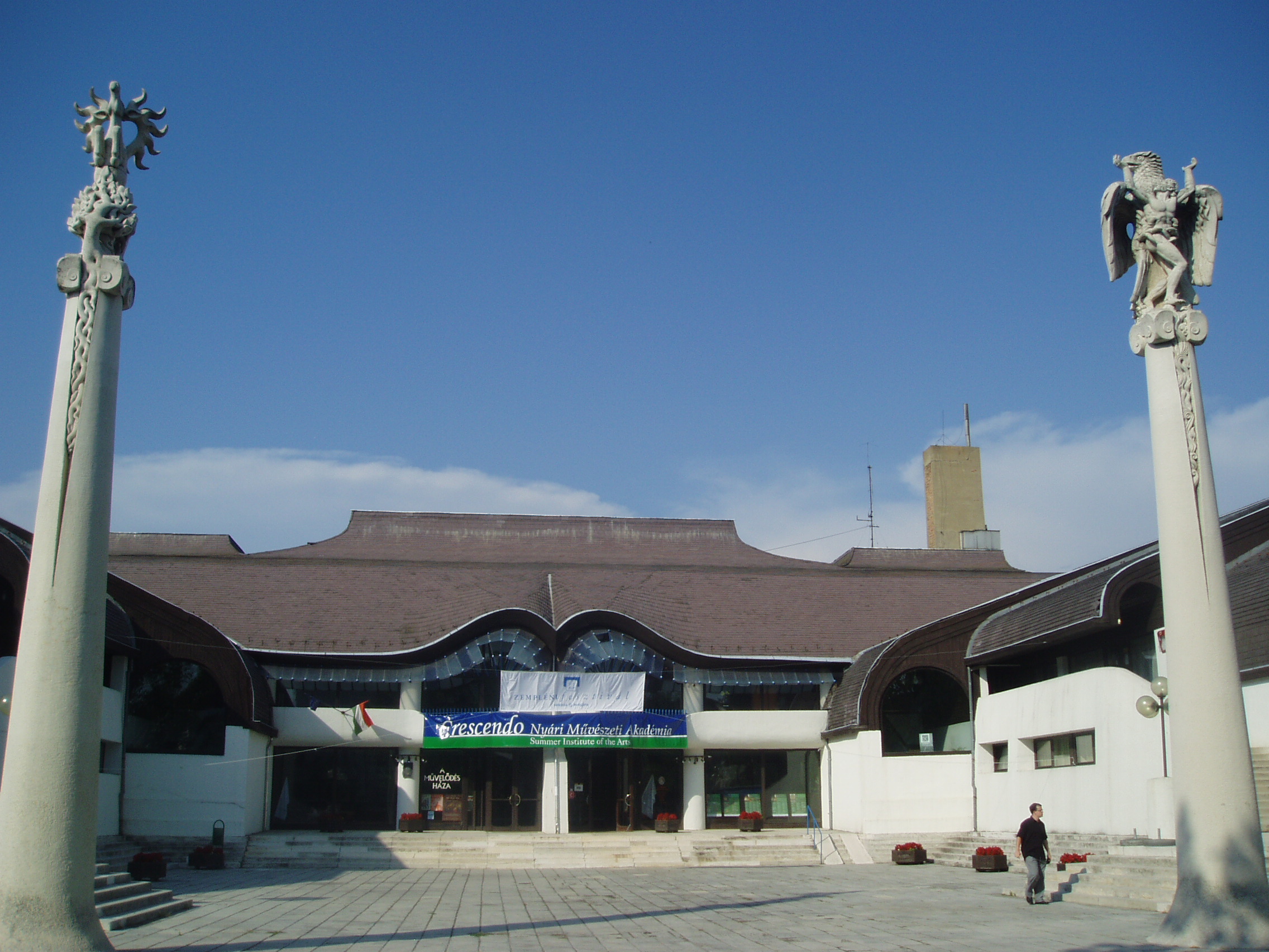 Nyilvános 1403 | 3079 | Sárospatak, Eötvös utca 21. A Művelődés Háza | Sárospatak megújuló városképében nyomon követhető Makovecz Imre építész munkássága, aki több épületet tervezett a városban: a művelődési házon kívül az Árpád Vezér Gimnáziumot és a Hild tér lakóházait. A Művelődés Háza monumentális, látványos építészeti megoldásokban bővelkedő alkotás. A Kortárs magyar művészeti lexikon megállapítása szerint régészeti lelet formáját vette alapul: egy spirális, középen csappal-tengellyel ellátott díszcsat alakját. Az alaprajz szívében levő nagy színházterem a központ, innen futnak az erővonalak egészen a szélső, kisebb terekig. Megvalósítása az 1970-es évek végének politikai légkörében sok küzdelmébe került tervezőjének. Felépülése után az UIA Kairói Világkongresszusának zsűrije az 1983-as év tíz legfontosabb épületének egyikévé nyilvánította. Az épülethez szervesen kapcsolódik a főbejárat előtt álló oszlopokon a magyarság eredetére utaló két szobor, amelyek Péterffy László szobrászművész munkái. A fénykép 2007 augusztusában készült. Felh. irod.: Látnivalók Borsod-Abaúj-Zemplén megyében. Miskolc, Well-PRess, 1995 Kortárs magyar művészeti lexikon. Bp. Enciklopédia, 1999-2001 Magyarország a XX. században III. kötet. Szekszárd, Babits Kiadó, 1998 www.amuvelodeshaza.hu/bemutat.htm |