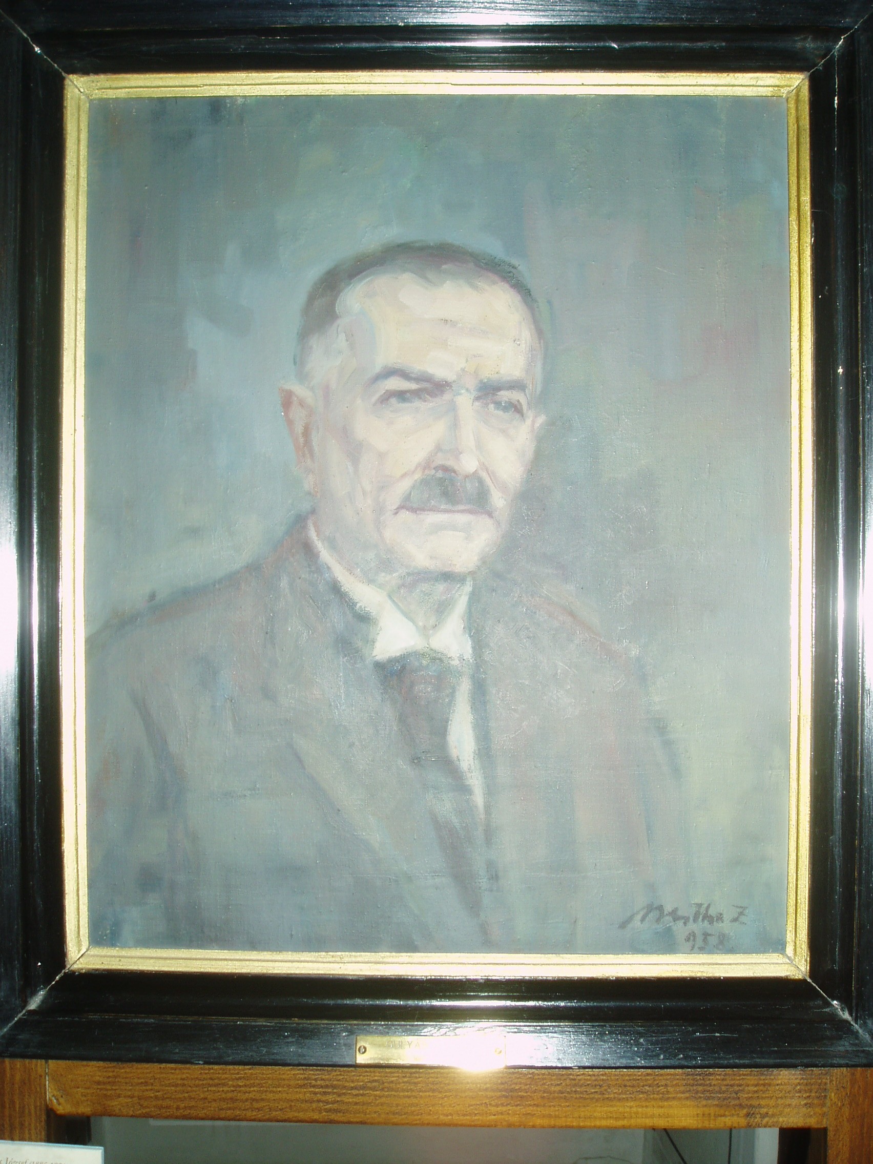 Nyilvános 1002 | 1524 | Sárospatak, Rákóczi utca 1. Református Kollégium könyvtára | A képen Gulyás József (1885-1954) főkönyvtárnok portréja, Bertha Zoltán olajfestménye látható. Gulyás József 1928 és 1944 között volt a könyvtár igazgatója. Több tanulmányt készített a főiskola és a könyvtár történetéről. A fénykép 2007 augusztusában készült. Felh. irod.: www.gradatio.hu/nagykonyvtar |