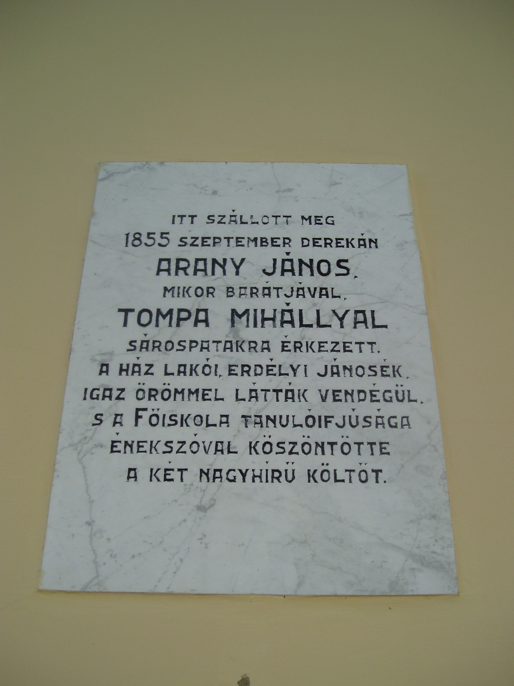 Nyilvános 1370 | 1861 | Sárospatak, Rákóczi utca 5. | A XVIII–XIX. századi épület a Kollégium bölcsészettanári lakása volt. 1851–1861 között itt lakott Erdélyi János költő, népdalgyűjtő, korábban pataki diák, ebben az időben a Református Kollégium bölcsészeti tanszékének professzora. Ebben a házban látta vendégül 1855. szeptember 20-án Arany Jánost és Tompa Mihályt. A fénykép 2007 augusztusában készült. Felh. irod.: Látnivalók Borsod-Abaúj-Zemplén megyében. Miskolc, Well-PRess, 1995 Erős Zoltán: Magyar irodalmi helynevek A-tól Z-ig. Bp. Kis-Lant Kiadó, 1995 |