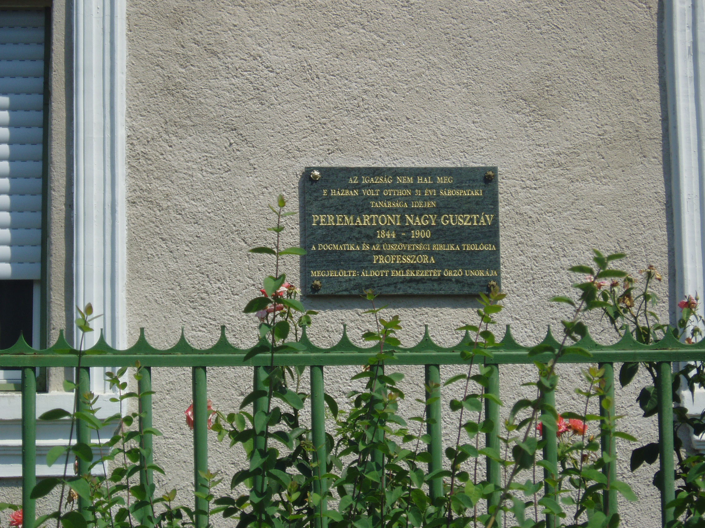 Nyilvános 1357 | 1955 | Sárospatak, Szemere utca 9. | Több, mint három évtizedig élt ebben a házban Peremartoni Nagy Gusztáv (1844-1900), a Református Kollégium teológia professzora. Egykori lakóházát unokája jelölte meg emléktáblával. A fénykép 2007 augusztusában készült. |