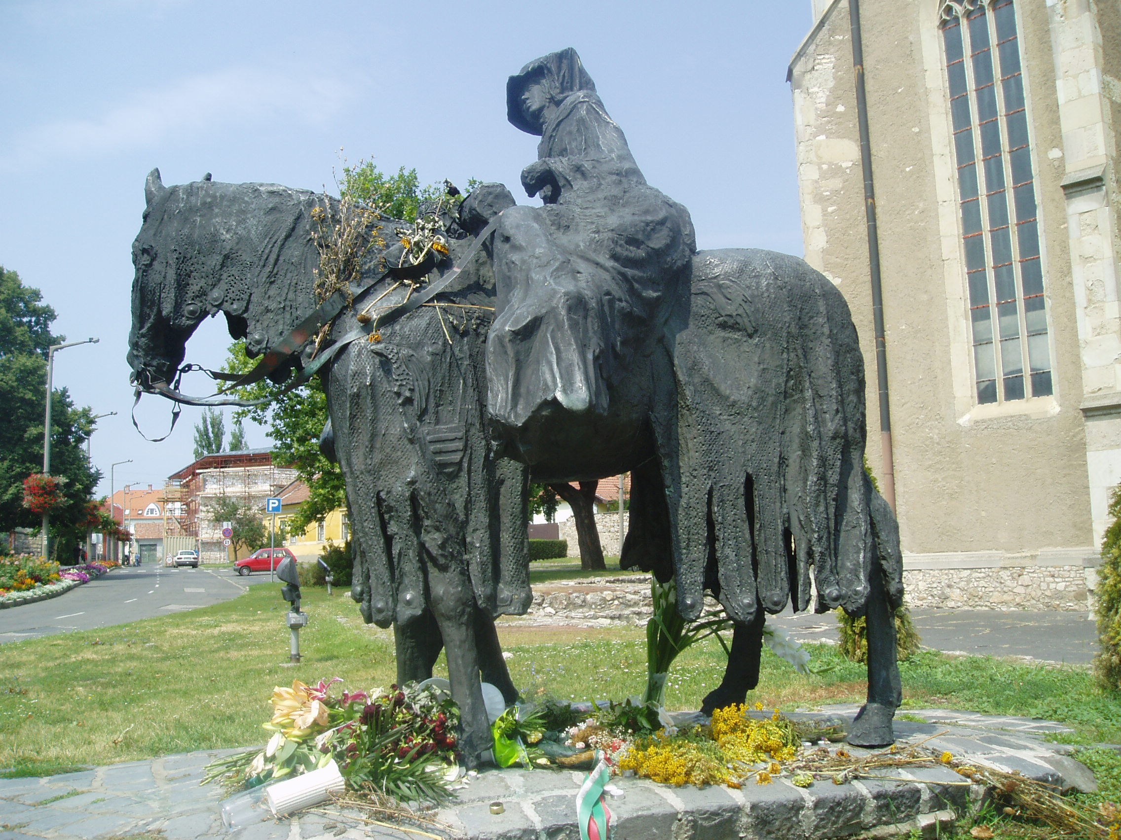 Nyilvános 842 | 1456 | Sárospatak, Szent Erzsébet utca | A Vártemplom oldalbejáratánál áll Varga Imre 1985-ben felállított, Szent Erzsébetet és férjét, Thüringiai Lajos őrgrófot megörökítő lovas szoborcsoportja. A hagyomány szerint Erzsébet rövid élete során többször is hazalátogatott, s a Wartburg vára és Patak közti távolságot lóháton tette meg. Szent Erzsébet 1207-ben Sárospatakon született, Gertrudisz királyné és II. Endre király lányaként. Nagy valószínűséggel a Vártemplom román kori elődjében - amelynek maradványai a szobor közelében láthatók - keresztelték meg. A fénykép 2007 augusztusában készült. Felh. irod.: Látnivalók Borsod-Abaúj-Zemplén megyében. Miskolc, Well-PRess, 1995 |