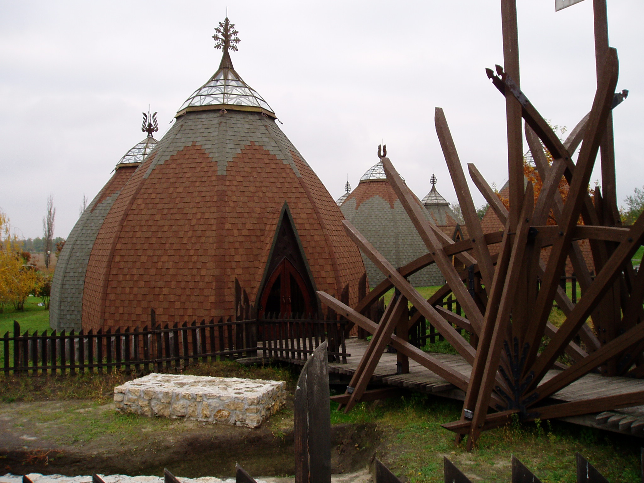 Nyilvános 1488 | 2424 | Ópusztaszer, Nemzeti Történelmi Emlékpark | Az Ópusztaszeri Nemzeti Történeti Emlékparkot az 1970-es évek legelején Erdei Ferenc szociográfus, a Magyar Tudományos Akadémia akkori főtitkára kezdeményezésére kezdték megtervezni és kialakítani. Mire 1995-re befejeződött a Feszty-körkép felújítása, Magyarország népszerű múzeumi kiállítóhelyei közül is az egyik leglátogatottabb lett. A történelmi emlékpark építészeti emlékei a honfoglaló ősök életmódját idézik. Az építészeti kialakításuk miatt is kedvelt, jurta-formájú kiállítóházakat Csete György és Dulánszky Jenő tervezte. Berendezésüket a honfoglalás kori ötvösművészetnek a motívumai ihlették. A fénykép 2004 októberében készült. Felh. irod.: www.vendegvaro.hu www.opusztaszer.hu |