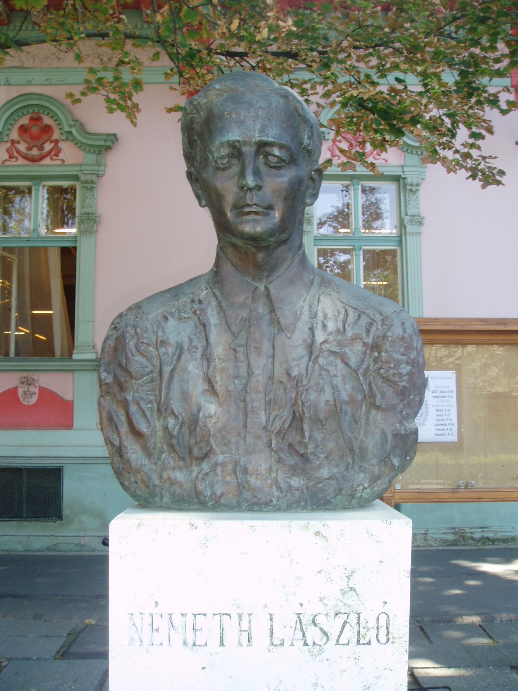 Nyilvános 1874 | 3665 | Hódmezővásárhely, Andrássy út 44. Németh László mellszobra a Németh László Városi Könyvtár előtt | A könyvtárat 1880-ban alapította a város közgyűlése. A vásárhelyi kötődésű nagy író nevét 1976-ban vette fel. Németh László a második világháborút követően több évig élt a városban. Irodalmat és matematikát tanított, s írói munkássága is rendkívül termékeny volt. Több művében, így például az Égető Eszterben is feldolgozta a vásárhelyi polgárok életét. A könyvtár épülete előtt Tóth Valéria által készített mellszobra, az épületben pedig emlékszoba idézi a XX. század egyik legnagyobb gondolkodójának szellemiségét. A Németh László Városi Könyvtár helyismereti különgyűjteménye négyezer olyan kötetet tartalmaz, amely vásárhelyi szerző műve, vagy a városról szól. A gyűjtemény őrzi többek között József Attila Medvetánc című kötetének első kiadását. A könyvritkaságok közül említést érdemel Szenci Molnár Albert (1574-1634) 1608-ban kiadott Szent Bibliája. A fénykép 2007 júliusában készült. Felh. irod.: Arató László - Bátyi Zoltán: Hódmezővásárhely az alföldi művészváros. Hódmezővásárhely, 2004 www.hodmezovasarhely.hu www.nlvk.hu/emlekszoba.php |