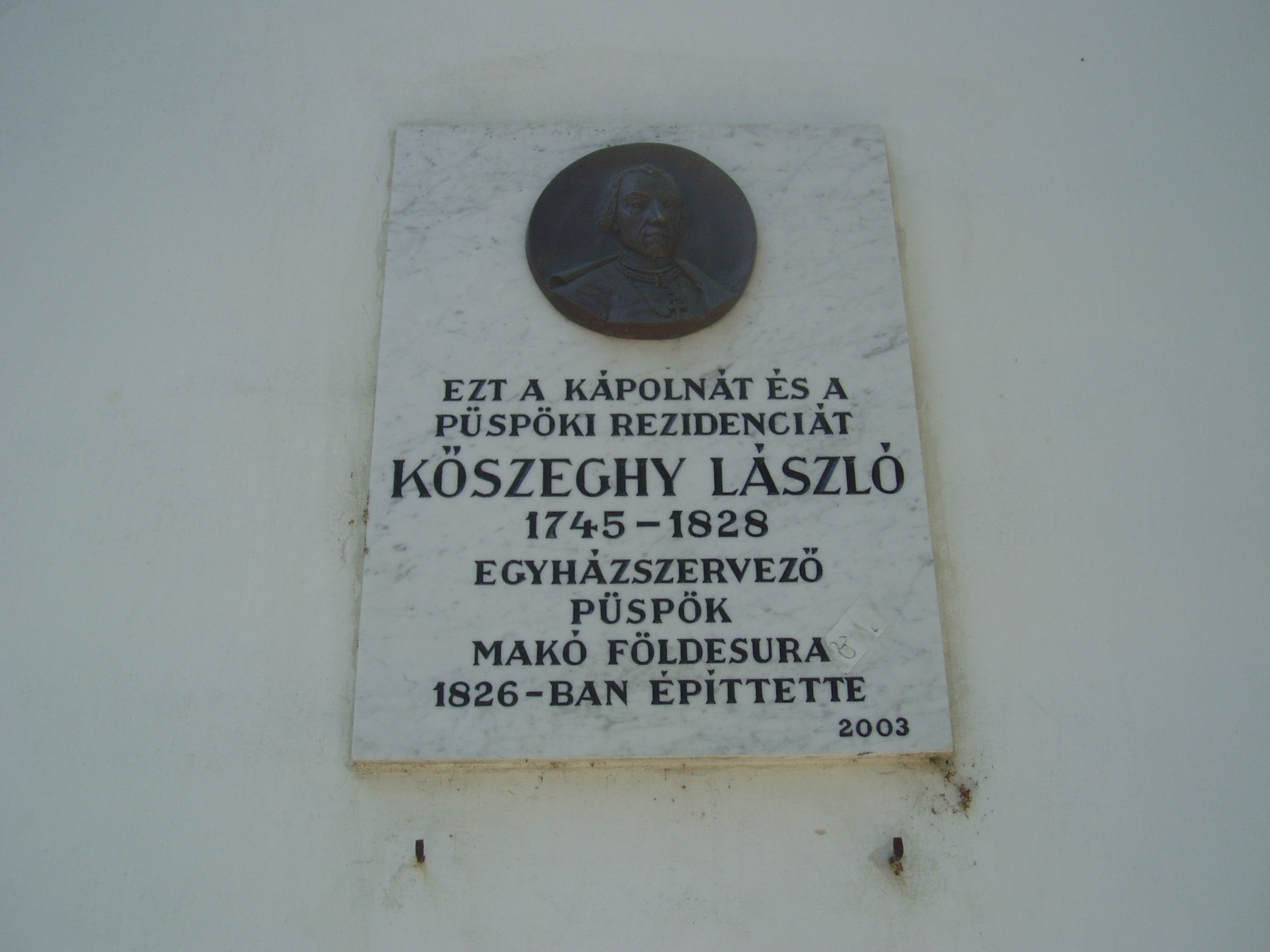 Nyilvános 1347 | 1804 | Makó, Csanád vezér tér 12. | A volt püspöki nyaralókastélyt a Temesvárott lakó Kőszeghy László (1745-1828) csanádi püspök emeltette 1826-ban a hozzá csatlakozó dór oszlopos kápolnával együtt. A külső homlokzaton jeles, az épülethez kötődő csanádi püspökök, illetve püspöki helynök emléktábláit helyezték el. A képen az építtető püspök emléktáblája látható. A fénykép 2007 júliusában készült. Felh. irod.: Barangolások Csongrád megyében. Miskolc, Well-PRess, 1997 |