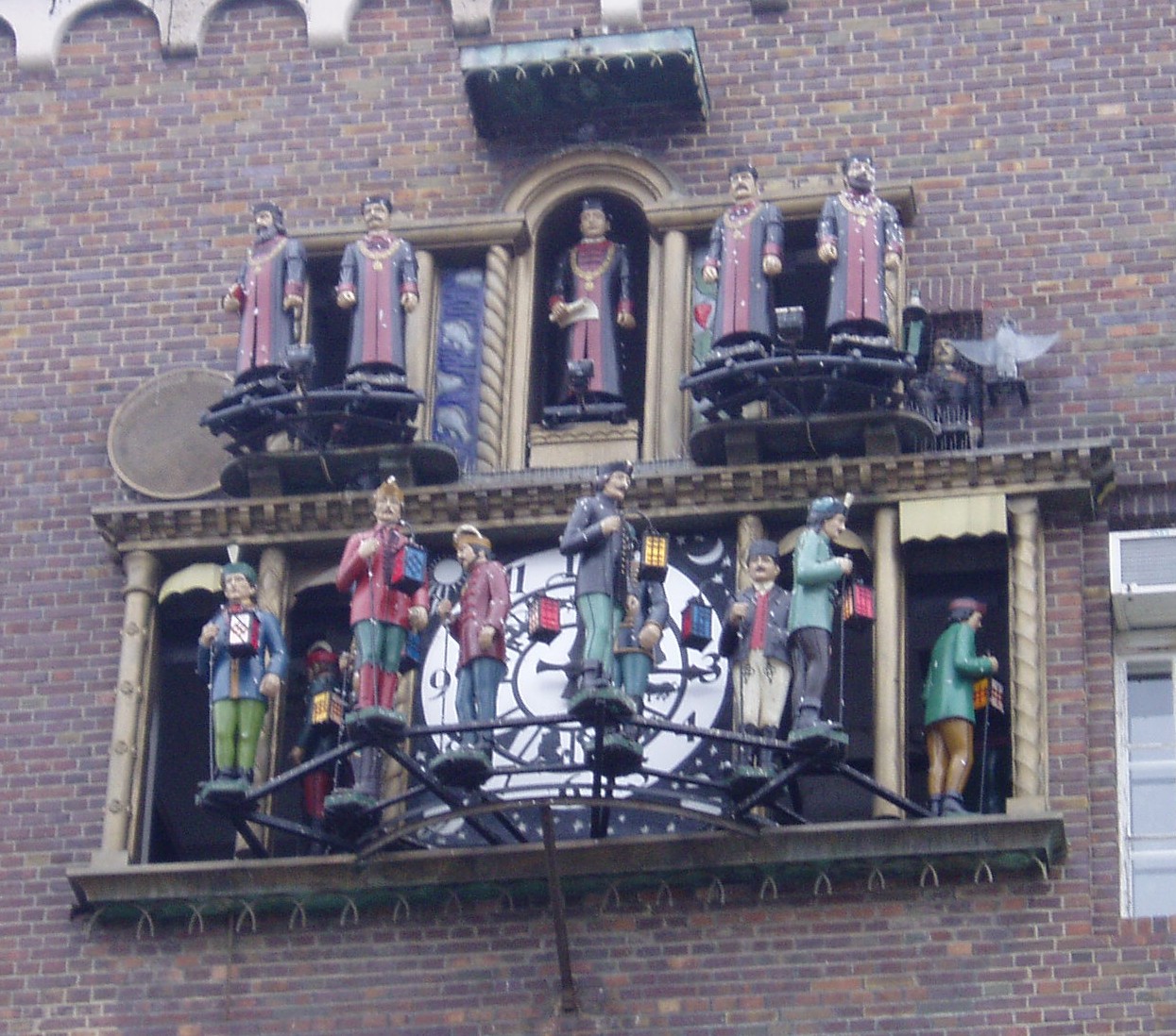 Nyilvános 832 | 2029 | Szeged, Dóm tér: Zenélő óra | A Dóm teret körülvevő egyetemi épület déli homlokzatán látható a Magyarországon egyedülálló zenélő óra, a középkori egyetemek egyik jelképe, amelyet Csuri Ferenc (1893—1959) órásmester és Kállay József faszobrász készített 1935-ben. A számlap körüli falnyílásokon az egyetemi tanácsot és a ballagó diákokat ábrázoló színes figurák vonulnak ki a Vaszy Viktor által feldolgozott Gaudeamus igitur zenéjére. A szobrocskák olyan híres emberek arcvonásait viselik magukon, mint Klebelsberg Kunó — rektorként, Brassai Sámuel, Mikes Kelemen, Petőfi Sándor, Csokonai Vitéz Mihály, Kazinczy Ferenc és mások — mint diákok. A fénykép 2004 októberében készült. Felh. irod.: Péter László: Szeged. Bp. Panoráma, 1981 www.vendegvaro.hu |
