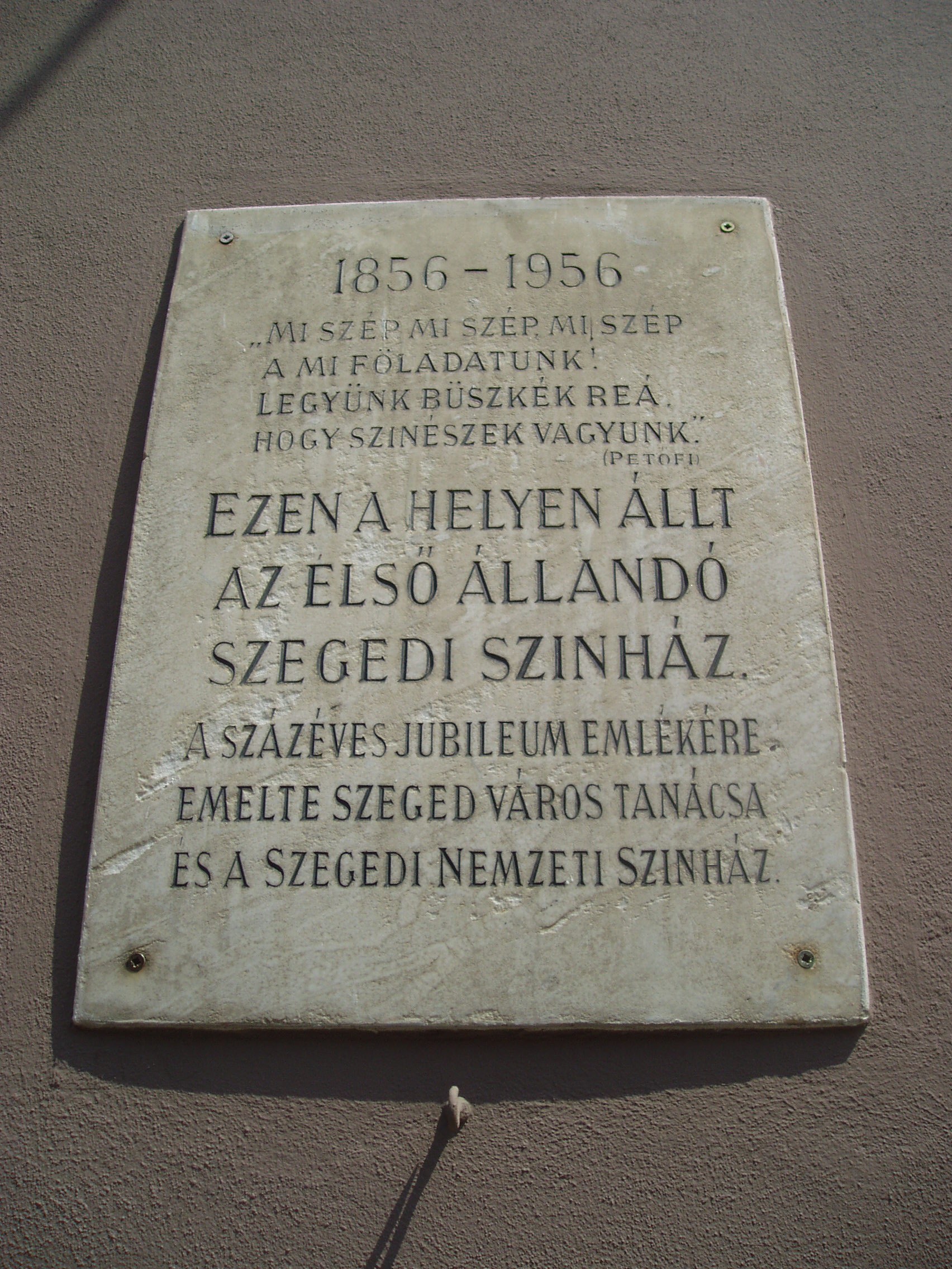 Nyilvános 1405 | 1865 | Szeged, Kelemen László utca 3. | Itt, a mai Hági étterem kerthelyiségének helyén állott Szeged első állandó, 1856-ban fából épült színháza, amelynek a Sörkert utcai homlokzaton állítottak emléktáblát. Az utcát az 1879-es árvízig Színház utcának is nevezték, ma pedig Kelemen László, az első magyar színigazgató nevét viseli, aki társulatával hosszabb ideig játszott Szegeden is (lásd: Szeged, Széchenyi tér 10.). Játszott itt Lendvay Márton, Szerdahelyi Kálmán, Prielle Kornélia. A színkör életében különösen emlékezetes volt az 1860/61-es évad, amelyet később a szegedi színjátszás aranykorának neveznek a színháztörténészek. Molnár György igazgató műsorpolitikáját egyfelől a közönség szórakoztatása, másfelől a haza iránti elkötelezettség határozza meg. A társulat megérkezésekor robbant ki a „kis forradalom”-nak nevezett tüntetéssorozat, amikor a szegediek a városháza előtt összegyűlve a betiltott Himnuszt, a Klapka– és Kossuth–indulókat énekelték a színészekkel együt, majd leverték az épületekről a császári címereket. A nagy árvízt követő újjáépítéssel szinte egyidőben határozta el a város, hogy méltó kőszínházat emel. A ma is álló épületet (lásd: Szeged, Deák Ferenc utca 12.) 1883-ban adták át rendeltetésének. A fénykép 2007 júliusában készült. Felh. irod.: Péter László: Szeged. Bp. Panoráma, 1981 Sándor János: A szegedi színjátszás krónikája. Szeged, Bába Kiadó, 2003 |