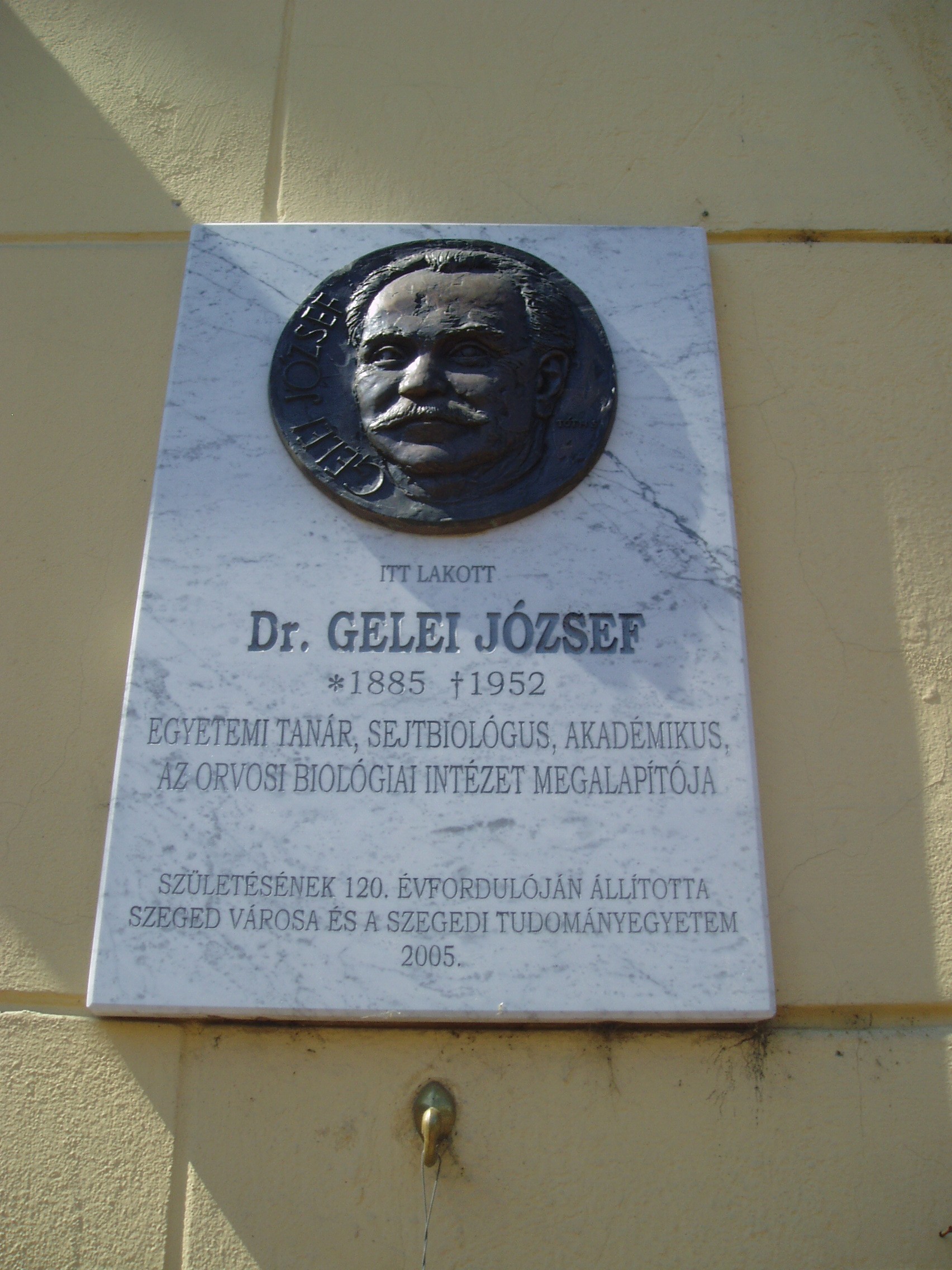 Nyilvános 808 | 1252 | Szeged, Tisza Lajos körút 37. | Az épületen 2005-ben elhelyezett portrédomborműves emléktábla tanúsága szerint itt lakott Dr. Gelei József (1885-1952) egyetemi tanár, sejtbiológus, akadémikus. A kolozsvári egyetemrő került az intézmény áttelepülésével Szegedre 1924-ben, ahol az állattani és összehasonlító bonctan tanára lett. Volt a természettudományi kar dékánja és az egyetem rektora. 1940-ben, Kolozsvár visszacsatolásakor az egyetemmel együtt visszatért Kolozsvárra, amelyet 1944 őszén újra el kellett hagynia. 1945-től a szegedi egyetem orvosi karán a biológia tanára, a biológiai intézet vezetője volt. A véglénykutatás, a citológia és a gerinctelenek mikrotechnikája területén nemzetközi szaktekintélynek számított. Nevéről számos újonnan felfedezett élőlényt neveztek el. A fénykép 2007 júliusában készült. Felh. irod.: www.bibl.u-szeged.hu/bibl/exhib/evfordulo/gelei/gelei.html |