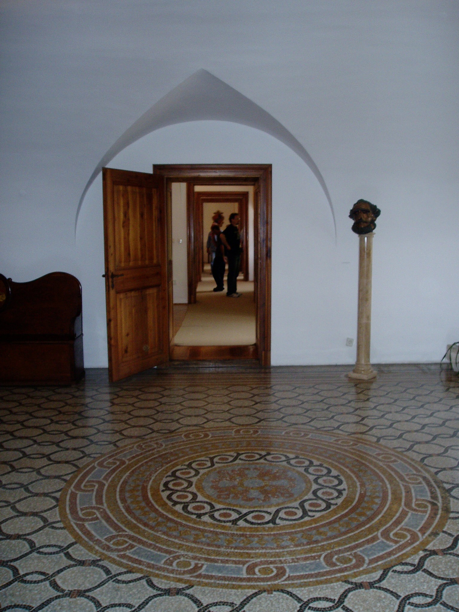 Nyilvános 1188 | 2200 | Nagycenk, Széchenyi-kastély | A barokk kastély építészeti szempontból is érdekes. Kiemelt jelentőségét azonban az adja, hogy itt élt a "legnagyobb magyarként" tisztelt Széchenyi István. A kastély ma emlékmúzeum. Az előcsarnok márvány mozaikpadlója a kastély eredeti értékei közé tartozik. A fénykép 2005 júliusában készült. Felh. irod.: Látnivalók Győr-Moson-Sopron megyében. Miskolc, Well-PRess, 2000 |