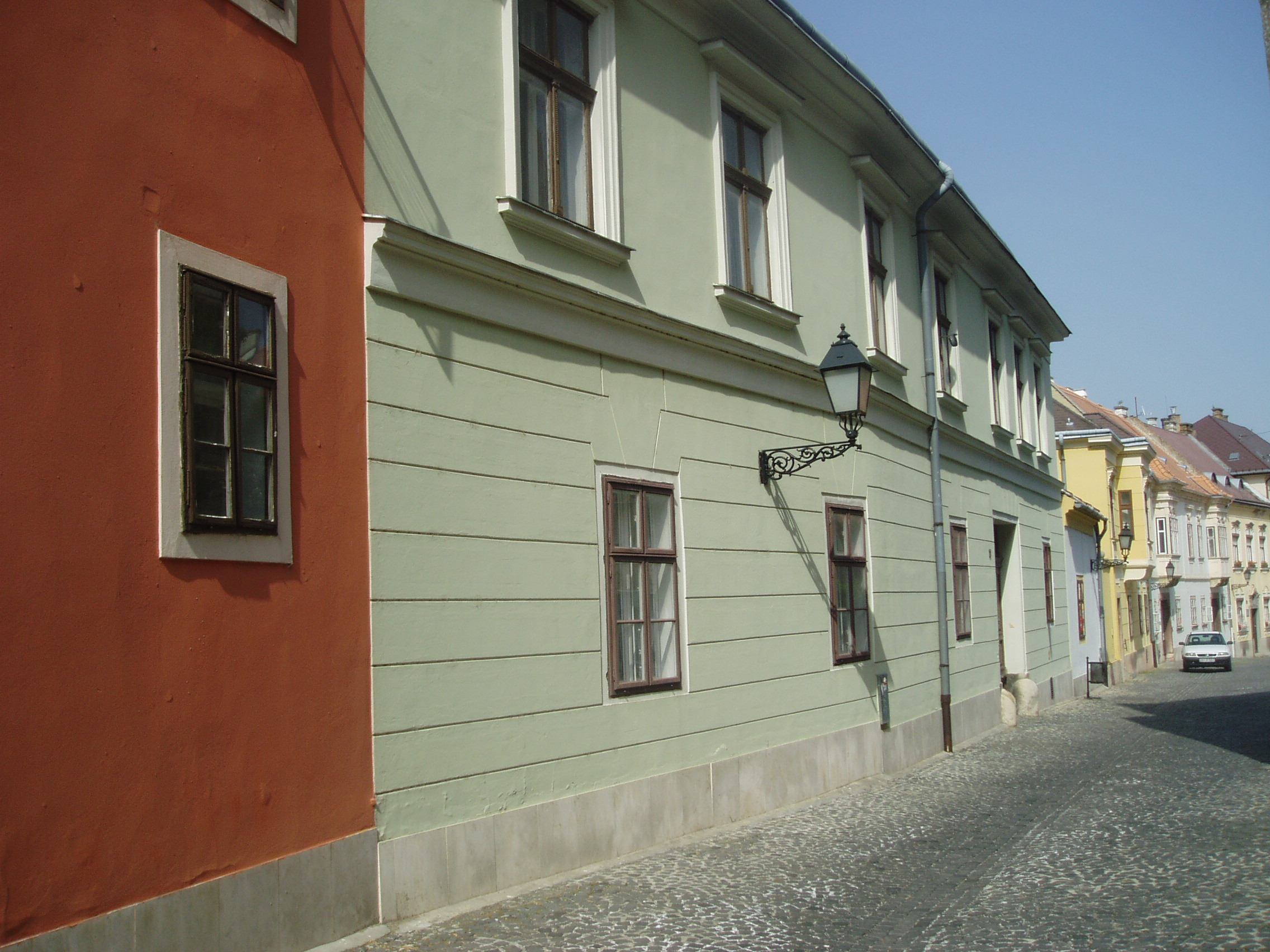 Nyilvános 1039 | 1950 | Győr, Káptalandomb 11. | A székesegyház apszisától kelet felé sétálva, a dombtetőről levezető út mentén találjuk a Káptalandomb legértékesebb műemlékházait. A 11. számú egyemeletes, klasszicista stílusú épület, mai homlokzata az 1800-as évek elején készült. A felvétel 2008 május végén készült. Felh. irod.: Cziglényi László: Győr. Bp. Panoráma, 1981 |