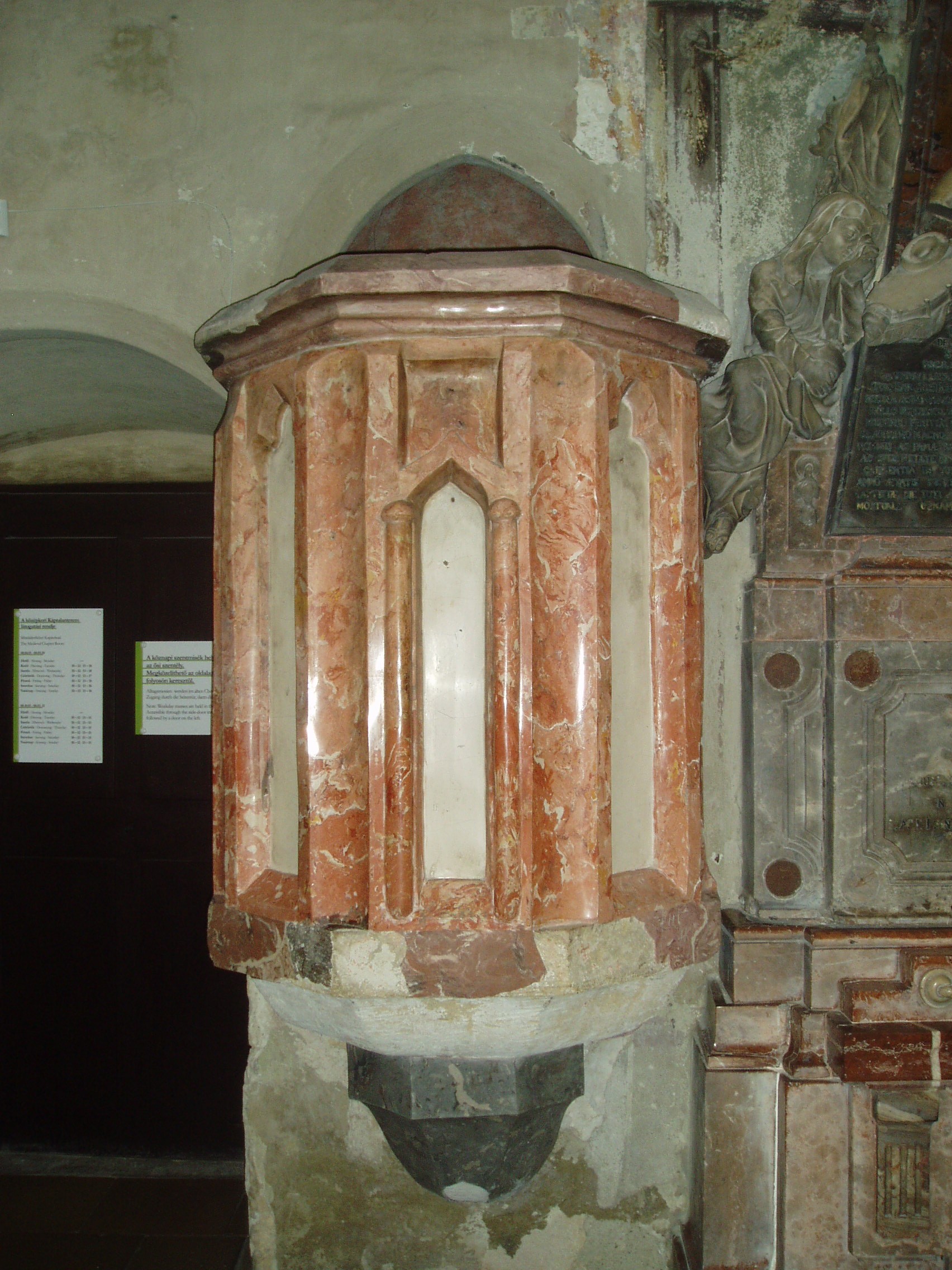 Nyilvános 1164 | 1426 | Sopron, Fő tér: Kecske-templom | A soproni Fő tér ékességét, a gótikus Kecske–templomot és a hozzá tartozó ferences kolostort a XIII. század második felében kezdték építeni. Tornya a XIV. század első negyedében készült el; mai alakja id. Storno Ferenc 1888–1894 között végzett helyreállításának eredménye. Szokatlan nevét a kapuzat felett látható faragott állatfiguráról kapta, amelyről kiderítették a kutatók, hogy az építtető Gaisel család címerállata volt. A képen látható kecske-domborművet Storno Ferenc faragta az eredeti alapján, amelyet most a Káptalanteremben lehet megtekinteni. Maga a templom faragott kőből épült, háromhajós, északi oldalán toronnyal díszített kora gótikus épület, berendezése a későbbi századokból származó barokk, illetve rokokó stílusú. A képen a déli templomhajó közepén álló, XV. századból származó, márványból készült szószék látható. Ebbe ágyazták bele azt a fából faragott szószéket, amelyről állítólag Kapisztrán János prédikált a templom előtt a török ellen. A templom többször volt színhelye országos jelentőségű ünnepségeknek, reprezentációs alkalmaknak: 1553 és 1681 között öt alkalommal falai között tartották az országgyűlési ünnepeket; 1625-ben királyt (III. Ferdinánd), 1622-ben és 1681-ben királynét koronáztak benne. 1787-ben feloszlatták a ferences rendet, s az épületegyüttest később a bencések kapták meg. A fénykép 2008 júniusában készült. Felh. irod.: Czellár Katalin: Sopron. 3. jav. kiad. Bp. Panoráma, 2000 Albert Tibor: Sopron–Vas vármegyei útikönyv. Magyar múlt — osztrák–magyar jelen. Kőszeg, Városkapu Kiadó, 2005 |