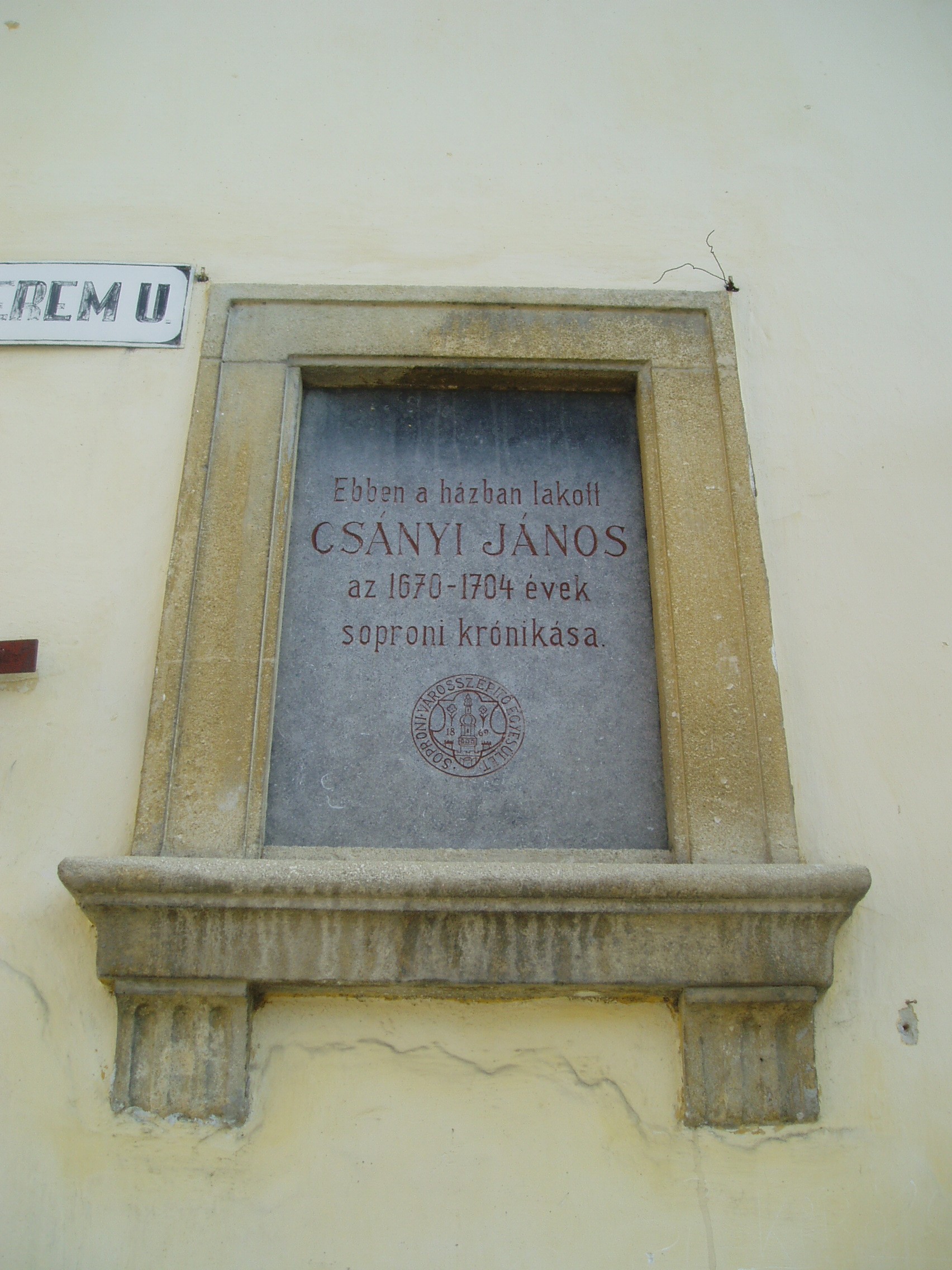 Nyilvános 1424 | 1933 | Sopron, Fövényverem utca 1. | A Bécsi külváros jellegzetes utcájának 1. számú háza a XVII. század második felében Csányi János soproni krónikásé volt. Mai formáját a XVIII. század elején kaphatta, bár homlokzatát a XIX. és a XX. században erősen átalakították. Csányi János (Hanns Tschány) egy, a XVII. század második és a XVIII. század első felében élt soproni evangélikus polgár volt. Sopron város tanácsának tagjaként működött, hivatalából azonban — nem tudni milyen okból — 1683-ban elbocsátották. Ezután bányamesterként dolgozott. E pozíciójában — más bányavárosokhoz hasonlóan — a bányaigazgatás teendőit látta el. Naplójának eredeti címe a kissé cirkalmas "Verzaichnus Etlicher Historien so von den 1670 Jahr her geschehen Ihn den Königreich Ungern, und absonderlich bey unser Stath Oedenburg welche ich Hanns Tschány zur sonderlicher Nachricht den Nachkömlingen hab aufgeschrieben" volt. A krónikás megörökítette a városban történt lényeges eseményeket, többek között a Haley-üstökös 1682 augusztusában történő feltűnését is. A napló az 1670-es esztendőben indul, és 1704-ben zárul, de már az utolsó évet fia, Csányi György Fülöp jegyezte. A feljegyzések nyomtatásban is megjelentek 1858-ban Pesten Paur Iván gondozásában, magyarázó előszóval a Magyar Történelmi Tár V. kötetében, valamint 1934-ben Sopronban, Ungarische Chronik vom Jahre 1670 bis 1704. Kivonat Hans Tschány’s… krónikás könyvéből címmel. A fénykép 2008 júniusában készült. Felh. irod.: Czellár Katalin: Sopron. 3. jav. kiad. Bp. Panoráma, 2000 http://csillagaszattortenet.csillagaszat.hu/magyar_17-18._sz._csillagaszata/csanyi_20080213.html |
