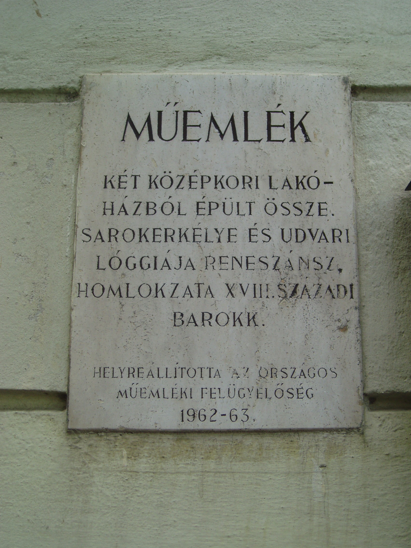 Nyilvános 1310 | 1621 | Sopron, Hátsókapu 2. | Az ún. Caesar–ház hatalmas reneszánsz sarokerkélyével a városkép jellegzetes eleme. Helyén valamikor több kisebb, valószínűleg a XV. században épült lakóház állt. Az 1676-ban Sopron belvárosát sújtó nagy tűzvész után ezek megmaradt részei, valamint a belső városfal maradványainak felhasználásával épült fel e pompás kis városi palota. Dongaboltozatos kapualjában megmaradtak a középkori ülőfülkék. Udvari szárnyának emeletén toszkán oszlopos, köríves árkádsor van. Az udvarból a falszorosban kialakított kertbe juthatunk, ahol látható a római és a ráépült középkori városfal, amelyet ablakokkal áttörve az épület hátsó homlokzataként használtak fel. Két emeleti termében megmaradt az 1700 körül készült, kora barokk ornamentális stukkómennyezet. Az 1681-es országgyűlés idején ebben az épületben ülésezett a főrendiház, ekkor választották Magyarország nádorává Esterházy Pál herceget, aki Harmonia caelestis című kantátasorozatával beírta nevét a magyar zenetörténetbe is. Az eseményt a Soproni Városszépítő Egyesület körpecsétjével ellátott emléktábla örökíti meg az épület homlokzatán. A fénykép 2008 júniusában készült. Felh. irod.: Czellár Katalin: Sopron. 3. jav. kiad. Bp. Panoráma, 2000 |