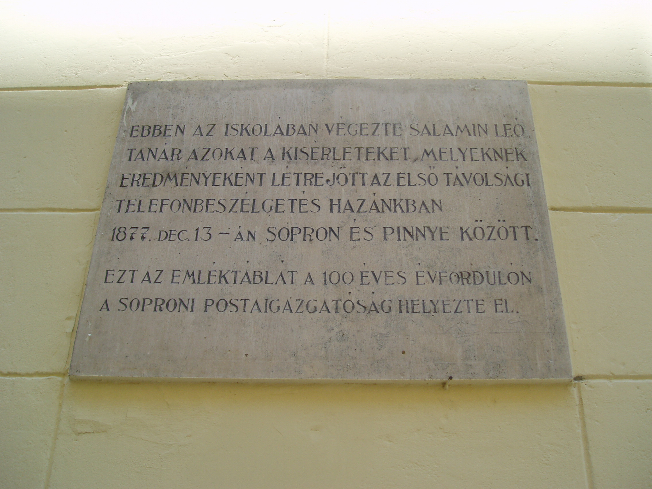 Nyilvános 1039 | 1393 | Sopron, Liszt Ferenc utca 2. | A Széchenyi István Gimnázium eredetileg reáliskola volt, amelyet 1850-ben alapítottak. Az épületen a soproni Postaigazgatóság által elhelyezett emléktábla megörökíti, hogy ebben az iskolában végezte Salamin Leó tanár azokat a kísérleteket, melyeknek eredményeként létrejött az első távolsági telefonbeszélgetés hazánkban 1877. december 13-án Sopron és Pinnye között. A kép 2008 júniusában készült. |
