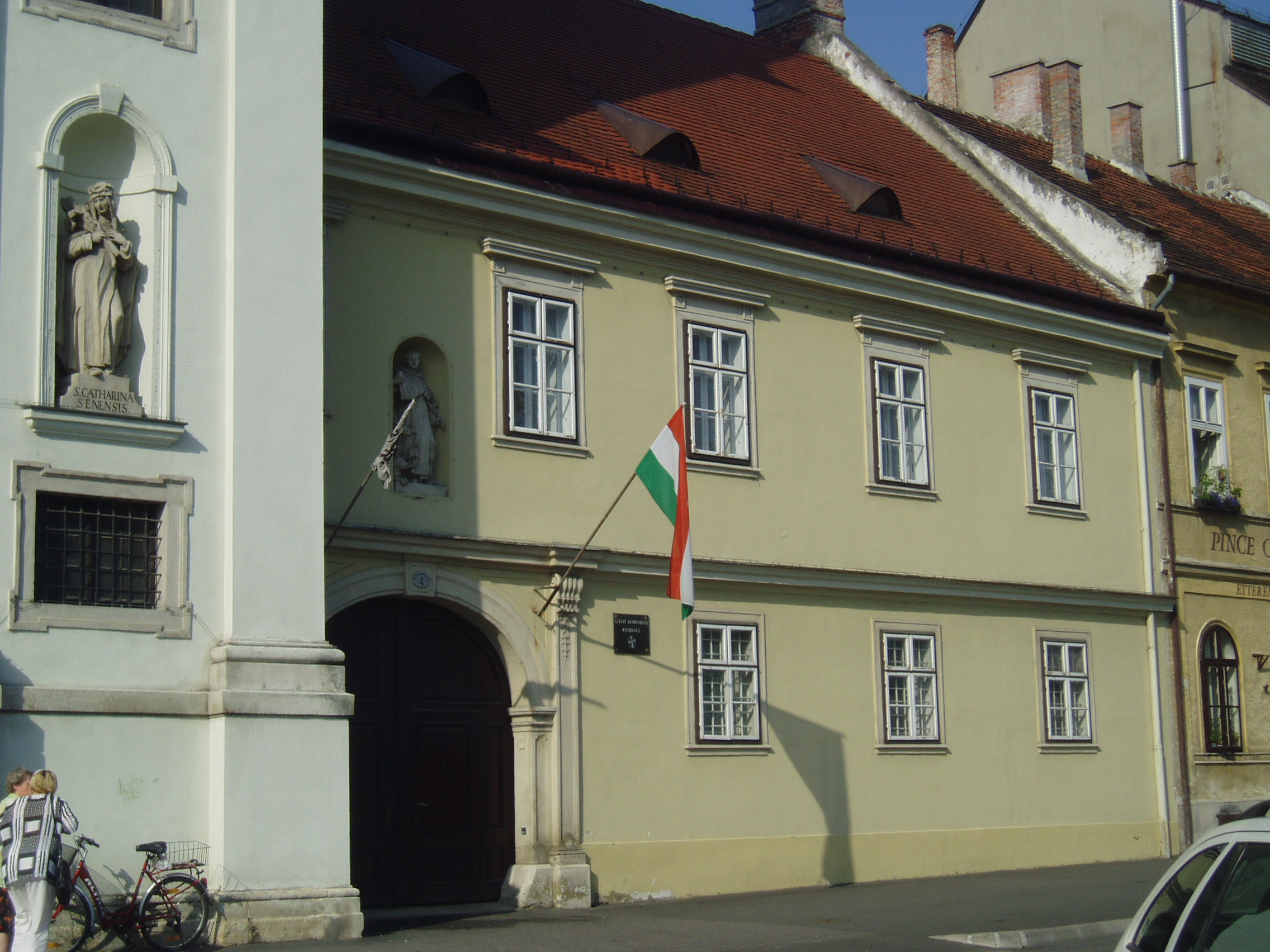 Nyilvános 764 | 1078 | Sopron, Széchenyi tér 4. | A templom mellett álló egyemeletes kolostort 1745-1750 között építették. A félköríves fülkében Szent Domonkos szobra áll. A Domonkos-rendi szerzetesek 1764-ben telepedtek le Sopronban s 1700-ban vásárolták meg a mai templom és a kolostorépület helyén álló két házat. A kép 2008 júniusában készült. Felh. irod.: Czellár Katalin: Sopron. 3. jav. kiad. Bp. Panoráma, 2000 |