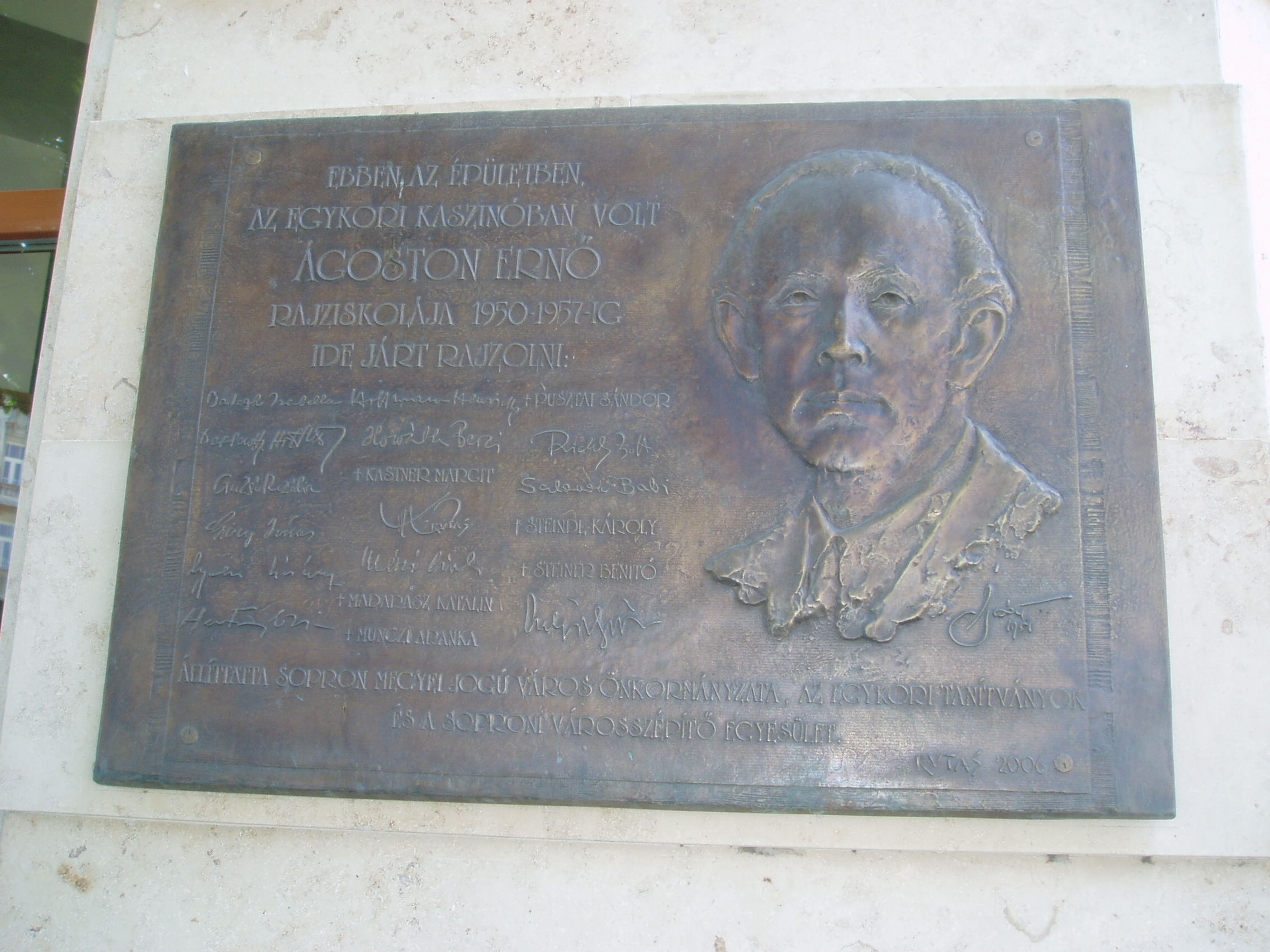 Nyilvános 1022 | 1483 | Sopron, Széchenyi tér 15. A Magyar Művelődés Háza | Mint egy nagyon szép bronz emléktábla tanúsítja, működött 1950 és 1957 között ebben az épületben működött Ágoston Ernő (1889-1957) rajziskolája. A képzőművész Ferenczy Károly és Réti István tanítványa volt, majd szülővárosában, Sopronban vállalt rajztanári állást. Élete főműveinek a kópházai református templomban található freskói számítanak, de mint grafikusművész is jelentőset alkotott. Vezetője volt a Soproni Képzőművészeti Körnek. Festői stílusa a posztimpresszionizmushoz tartozik. Emlléktáblája Kutas László alkotása, 2006-ban avatták fel számos egykori tanítványa jelenlétében. A kép 2008 júniusában készült. Felh. irod.: http://hu.wikipedia.org/wiki/%C3%81goston_Ern%C5%91 http://cyberpress.sopron.hu/article.php?id=12677 |