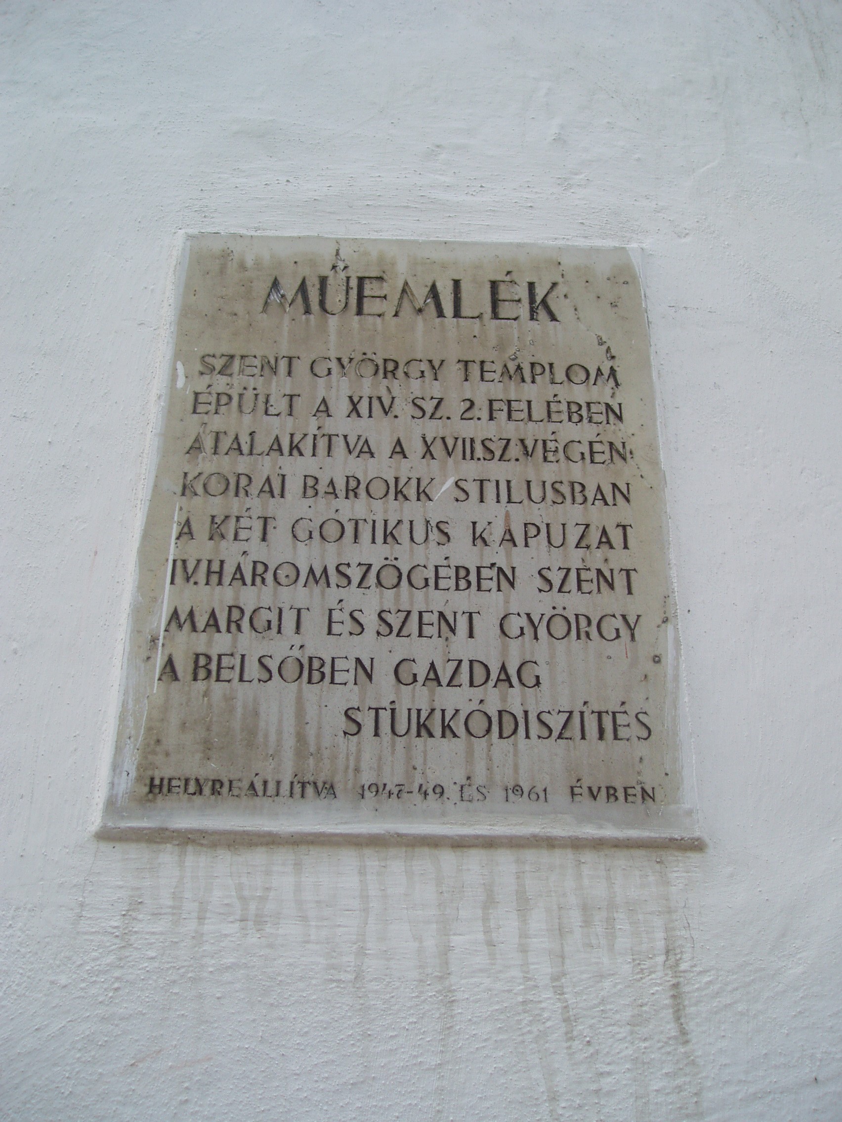 Nyilvános 981 | 1369 | Sopron, Szent György utca 7. Szent György-templom | A Káptalan-házhoz azonos házszámmal csatlakozik a Szent György-templom. Az 1380–1430 között épült, eredetileg gótikus templom mozgalmas, olaszos homlokzata a XVII. századból származik, de rajta két gótikus dombormű máig megőrződött. Kisebb mértékben az 1760-as években is átalakították. Eklektikus tornya 1882-ben épült. Az egyhajós templomot az 1676-os tűzvész után több lépésben alakították át: a csúcsíves lezárású főhajót gazdag stukkóval díszítették, és két oldalán kápolnasorral keretezték. A szentély melletti keresztelőkápolnában középkori freskótöredéket látni. Az 1705–1706 között készült stukkódísz Pietro Antonio Conti műve, és berendezése is XVIII. századi. A kép 2008 júniusában készült. Felh. irod.: Czellár Katalin: Sopron. 3. jav. kiad. Bp. Panoráma, 2000 |