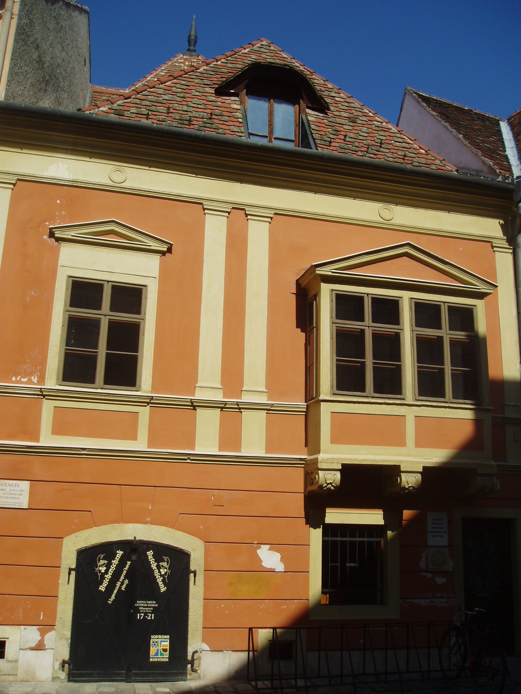Nyilvános 820 | 1143 | Sopron, Új utca 4. | Az egyemeletes lakóház középkori eredetű. Falai lakótorony maradványait rejtik. Zárt erkélye a XVII. századból származik, de homlokzatának többi részét a XIX. században átalakították. A kép 2008 júniusában készült. Felh. irod.: Czellár Katalin: Sopron. 3. jav. kiad. Bp. Panoráma, 2000 |