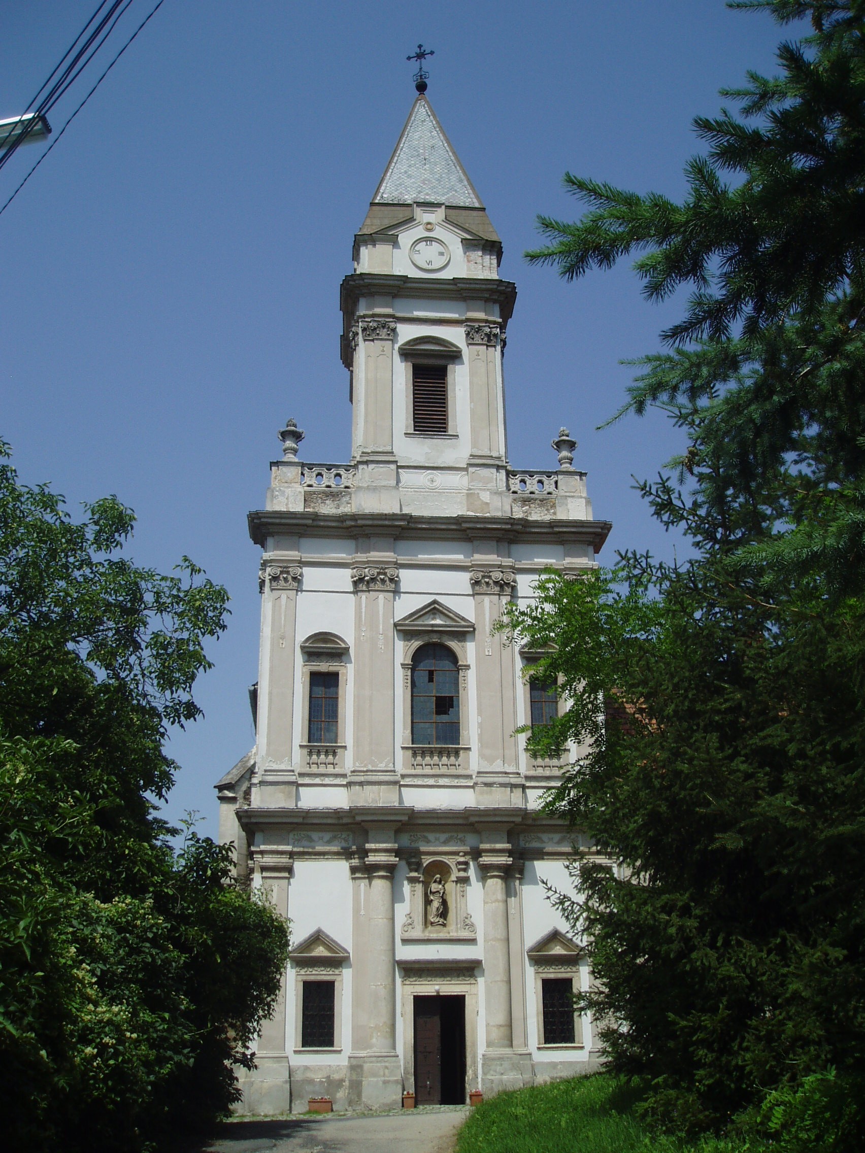 Nyilvános 1409 | 2068 | Sopronbánfalva: Kolostorhegy út: Karmelita templom és kolostor | Sopronbánfalva fölött a Sopronból Brennbergbányára vezető út déli oldán magas domb emelkedik. A dombot uraló gótikus eredetű, első formájában a XV. század végén épült templom és a hozzá csatlakozó barokk kolostorszárnyak eredetileg pálos szerzetesek, majd karmelita apácák otthona volt. Az épületegyüttest a település központjával a meredek domboldalban egyenesen húzódó díszes lépcső köti össze, amelyet karmelita-, vagy pálos lépcsőként ismer a köztudat. A lépcső hét lépcsőkarból és hét pihenőből áll. A pihenőkön, a baluszteres mellvéden jobbról-balról egy-egy szent kőszobra áll. A kép 2008 júniusában készült. Felh. irod.: Czellár Katalin: Sopron. 3. jav. kiad. Bp. Panoráma, 2000 |