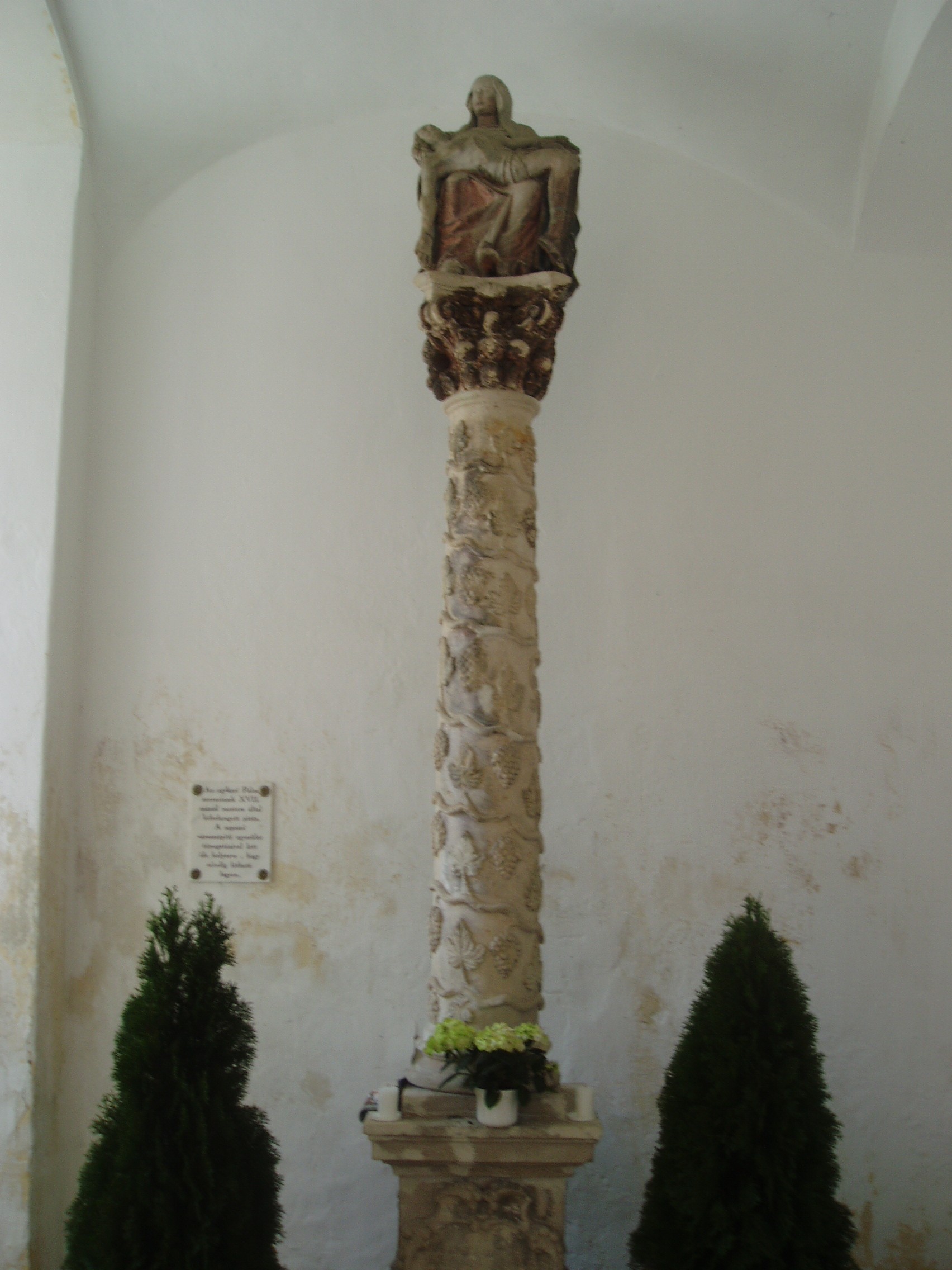 Nyilvános 824 | 1375 | Sopronbánfalva: Kolostorhegy út: Karmelita templom és kolostor | Sopronbánfalva fölött a Sopronból Brennbergbányára vezető út déli oldán magas domb emelkedik. A dombot uraló gótikus eredetű, első formájában a XV. század végén épült templom és a hozzá csatlakozó barokk kolostorszárnyak eredetileg pálos szerzetesek, majd karmelita apácák otthona volt. Az épületegyüttest a település központjával a meredek domboldalban egyenesen húzódó díszes lépcső köti össze, amelyet karmelita-, vagy pálos lépcsőként ismer a köztudat. A lépcső hét lépcsőkarból és hét pihenőből áll. A pihenőkön, a baluszteres mellvéden jobbról-balról egy-egy szent kőszobra áll. A kép 2008 júniusában készült. Felh. irod.: Czellár Katalin: Sopron. 3. jav. kiad. Bp. Panoráma, 2000 |
