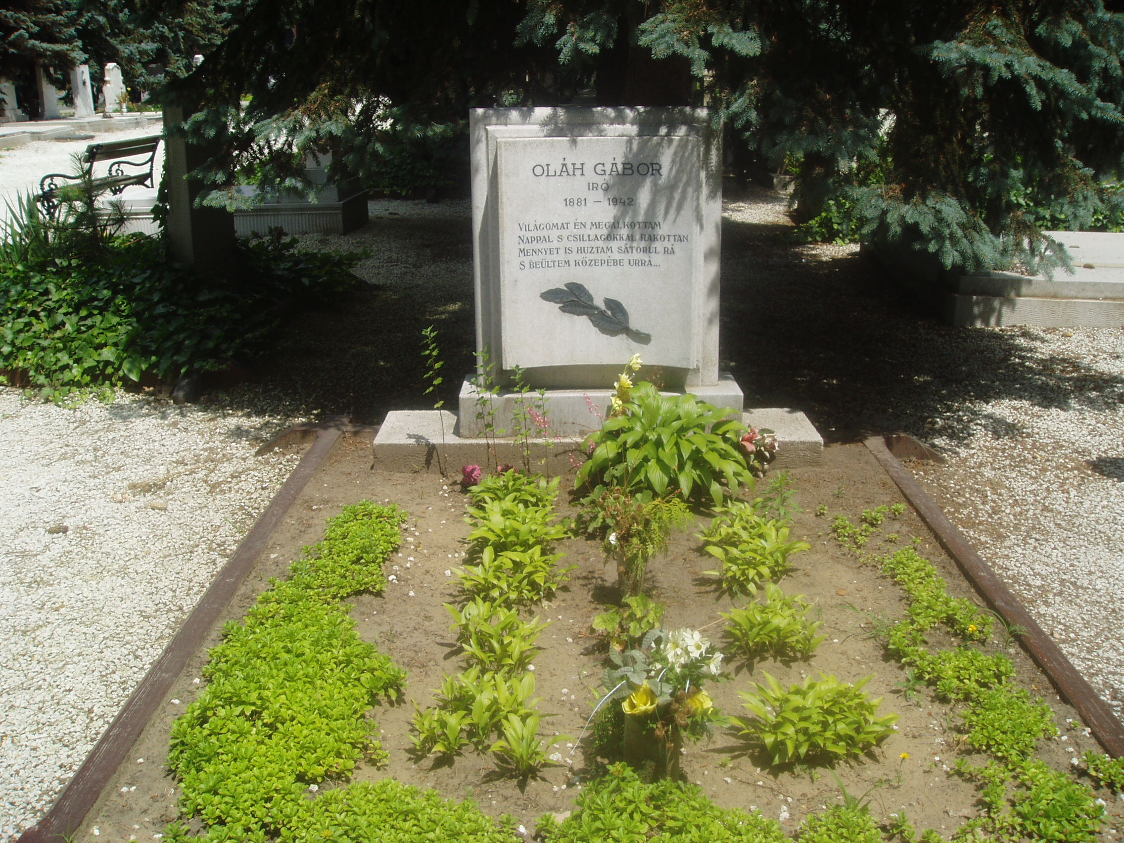 Nyilvános 1205 | 2801 | Debrecen, Bocskai út, Köztemető: Oláh Gábor sírja | Debrecen új köztemetőjét 1932-36 között alakították ki. A temetőkertet és a nagy művészettörténeti értéket képviselő ravatalozó épületét Borsos József tervezte. A díszsírhelyek a főbejárattól jobbra helyezkednek el. Itt nyugszik a magyar művelődéstörténet számos nagy alakja, akiknek földi maradványait áthozták a többnyire felszámolt régi temetőkből. Itt van Oláh Gábor (Debrecen, 1881. jan. 17. – Debrecen, 1942. jún. 23.): író, költő, újságíró, tanár sírja. A fénykép 2006 júniusában készült. Felh. irod.: Kovács Gergelyné: Debrecen. Bp. Panoráma, 1981 |