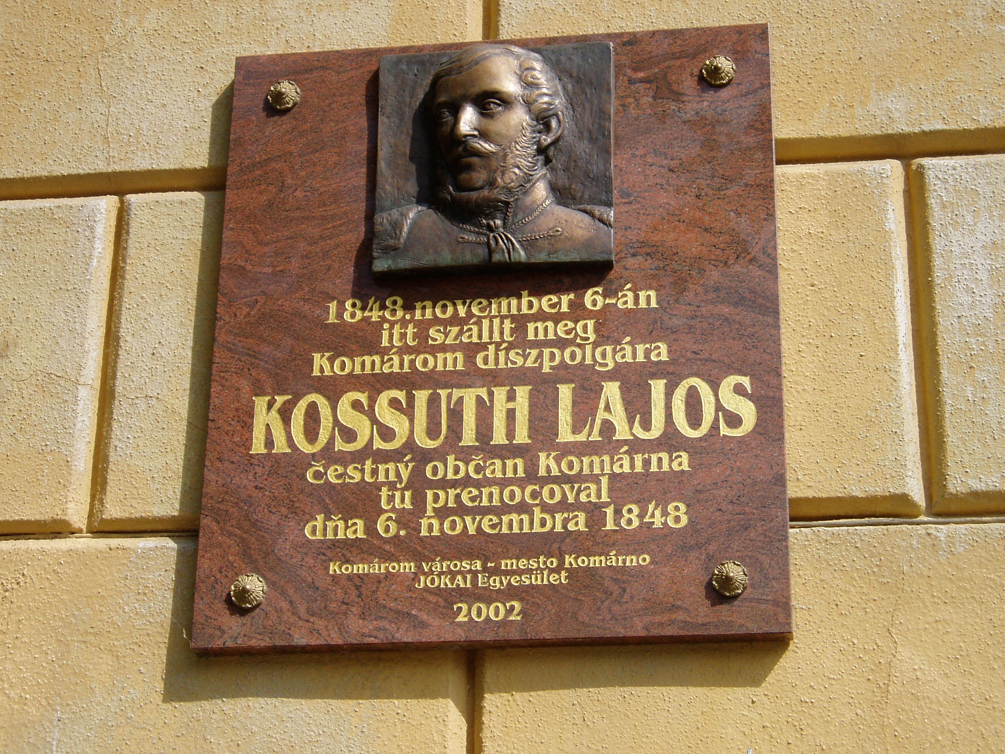 Nyilvános 1384 | 3713 | Komárom (Komárno), Klapka tér 2. | Az eredetileg a Komáromi Első Takarékpénztár székházának 1884-ben emelt, Ney Béla által tervezett épülete ma rendelőintézet. Helyén korábban az ún. Dumcsa–ház állott, ebben székelt 1848/49 történelmi hónapjaiban a magyar térparancsnokság. Az épületet lábasháznak is nevezték városszerte, mert az utcafronton árkádos oszlopai voltak. Az 1849. augusztus 3-án lezajlott győztes ácsi csata után itt, az épület előtt tartottak katonai parádét, amelyen dokumentálhatóan először hangzott fel Egressy Béni friss szerzeménye, a Klapka–induló, szerzője vezényletével, a VIII. hadtest zenekarának előadásában. A mostani épületen Kossuth Lajos emléktáblája olvasható, aki itt szállt meg toborzókörútján, 1848. november 6-án. A fénykép 2005. júliusában készült. Felh. irod.: www.komarno.sk Mácza Mihály: Komárom nevezetességei. Pozsony, Madách-Posonium, 2002 Szénássy Zoltán: A komáromi induló hőse. Rév–Komárom. KT Kiadó, 1998 |