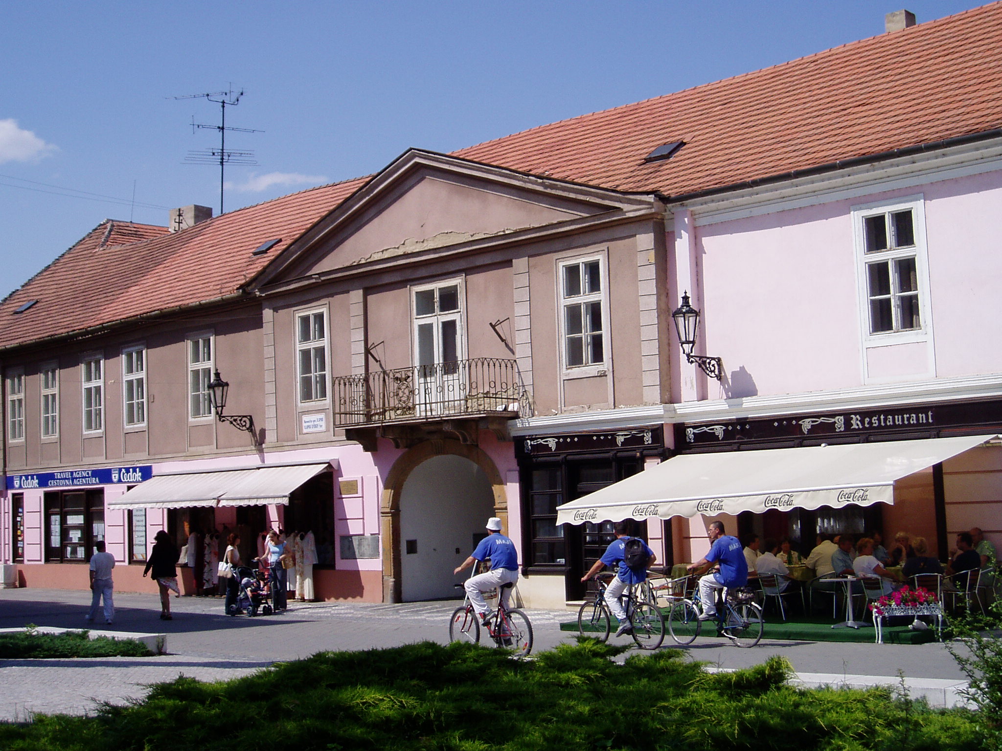 Nyilvános 973 | 2043 | Komárom (Komárno). Klapka tér 9. Zichy-palota | A Klapka tér legnagyobb épülete a volt Zichy–palota. Zichy Miklós gróf, szabolcsi főispán építtette a XVII. század második felében. Eredetileg barokk stílusú volt, de miután a 1763-as nagy komáromi földrengés romba döntötte, klasszicista stílusban épült újjá, két épületszárnnyal bővülve. Udvarának végén az 1800-as évek elejétől 1827-ig emeletes épület állt, ennek emeleti részén tartották a táncmulatságokat és a színházi előadásokat. Az első hivatásos magyar színtársulat Komáromban Benke József és Kemény János vezetésével lépett fel 1811 májusában (ők a második pesti színtársulatból váltak ki). A társulatban ott volt Balogh István, Déry István, Láng Ádám, Murányi Zsigmond, Murányiné Lefèvre Teréz és a pályája legelején levő, tizennyolc éves Scheckenbach (Schenbach) Róza, aki később Déryné Széppataki Róza néven vált a magyar játékszín történetének állócsillagává. Legközelebb Balogh István székesfehérvári társulata jutott el Komáromba, valamikor 1813 és 1815 között. Szinnyei József szerint ennek a társulatnak Katona József is tagja volt, s Idegen művésznéven fellépett itt a Hamlet címszerepében és saját, Luca széke című darabjában. 1819 októberében Kilényi Dávid kecskeméti társulata érkezett a városba. Előadásaikról Ásvay Jókay József, Jókai Mór édesapja tudósított a helyi sajtóban. A közelmúltban a Zichy–palota udvarán építették ki az ún. Európa udvart. A helyi viszonylatban gigantikus méretű vállalkozás célja, hogy élőben mutassa be harmincöt európai ország építészetét. A városrész egyben Komárom új szolgáltató központja is, üzletekkel, éttermekkel, kávézókkal, valamint egy föld alatti bevásárlóközponttal. A palota első emeletén (bejárat a képen látható kapun a Szentháromság-szobor mellett) a város két híres szülötte, Jókai Mór és Lehár Ferenc emlékkiállítása látható. Különösen a Jókai-kiállítás gazdag eredeti relikviákban. A fénykép 2005. júliusában készült. Felh.irod.: www.komarno.sk Mácza Mihály: Komárom nevezetességei. Pozsony, Madách-Posonium, 2002 Szénássy Zoltán: Rév–Komárom. KT Kiadó, 1998 Tóth László: "...miként hajdan az apostolok" : a komáromi magyar színjátszás története. Dunaszerdahely, Lilium Aurum, 1997 |