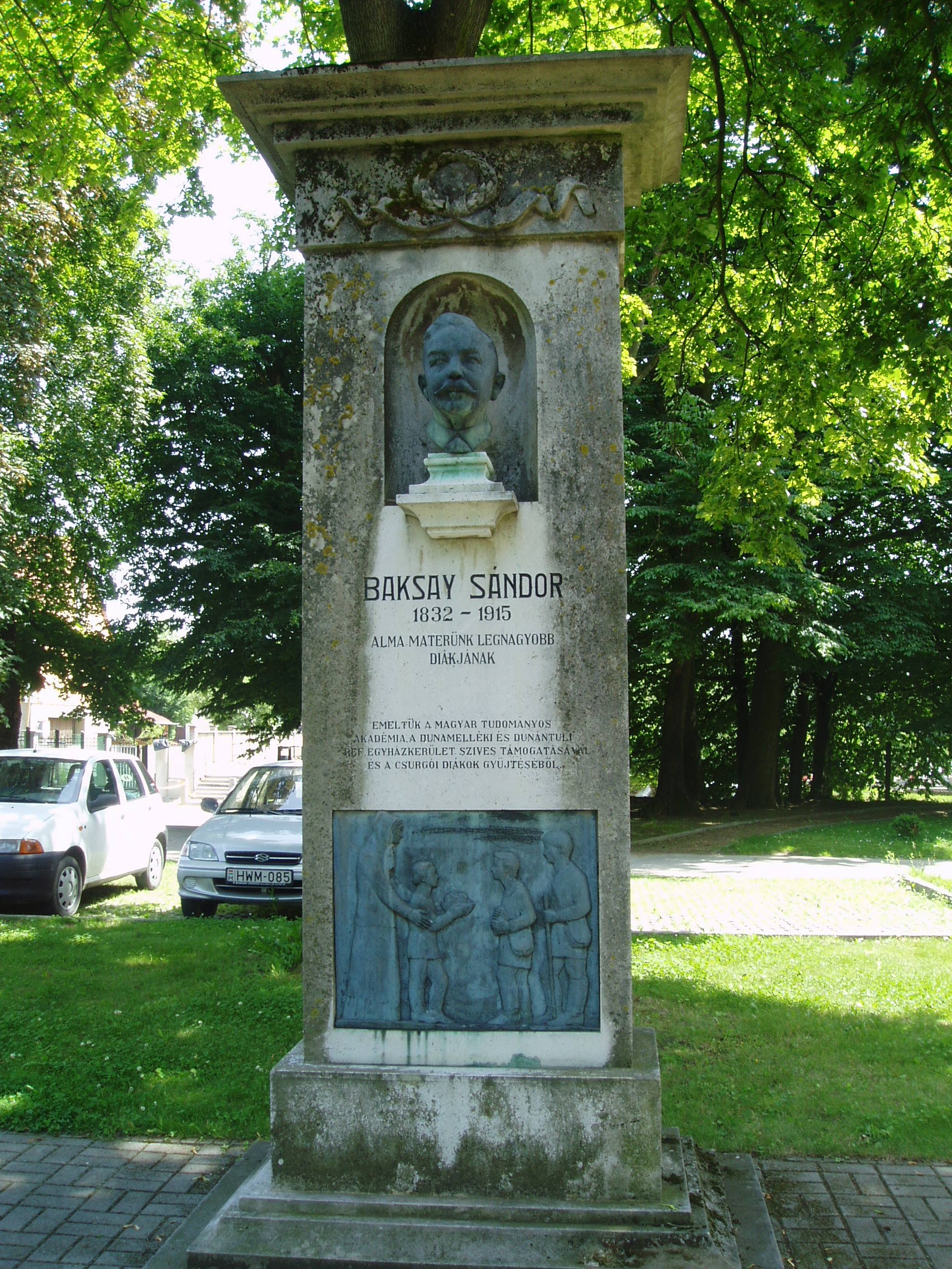 Nyilvános 898 | 1787 | Csurgó, Széchenyi tér 9. Baksay István emlékműve | A Csokonai Vitéz Mihály Református Gimnázium és Általános Iskola mai épülete az egykori vadasparkban áll. A nagy kiterjedésű, 4 hektárnyi parkban nyolcvan féle, ritkaságszámba menő növényfaj él. A látogatót együttesen ragadja meg a patinás iskola látványa, a hatalmas ősfák közötti sétányok hangulata és a neves egyéniségek tiszteletére állított emlékek együttese. Baksay Sándor egykori csurgói diák emlékoszlopát, amelyet Jálics Ernő tervezett, 1939-ben állították fel a parkban. Kis fülkében portrészobra látható; alatta tisztelgő felirat s az író "Nagymama karácsonyja" című elbeszéléséből származó idézet olvasható. Az emlékművet Áprily Lajos költő avatta fel. Baksay Sándor (1832-1915) 1839-ben lett a csurgói gimnázium diákja. Fontos szerepet játszott a gimnázium reformkori történelmében az önképzőkör megalapításával. Elbeszélésekben és visszaemlékezéseiben is megörökítette az akkori Csurgót és gimnáziumát. Az Osztrák-Magyar Monarchia írásban és képben című könyvsorozatban ő ismertette Somogy megyét. A fénykép 2004 októberében készült. Felh. irod.: Horváth József: Csurgó. Műemlékek. Bp. Tájak, Korok, Múzeumok Kiskönyvtára 441. 1982 Csurgói kalauz. Szerk. Terényi Zoltán. 1974 Látnivalók Somogy megyében. Miskolc, Well-PRess Kiadó, 2000 www.vendegvaro.hu |