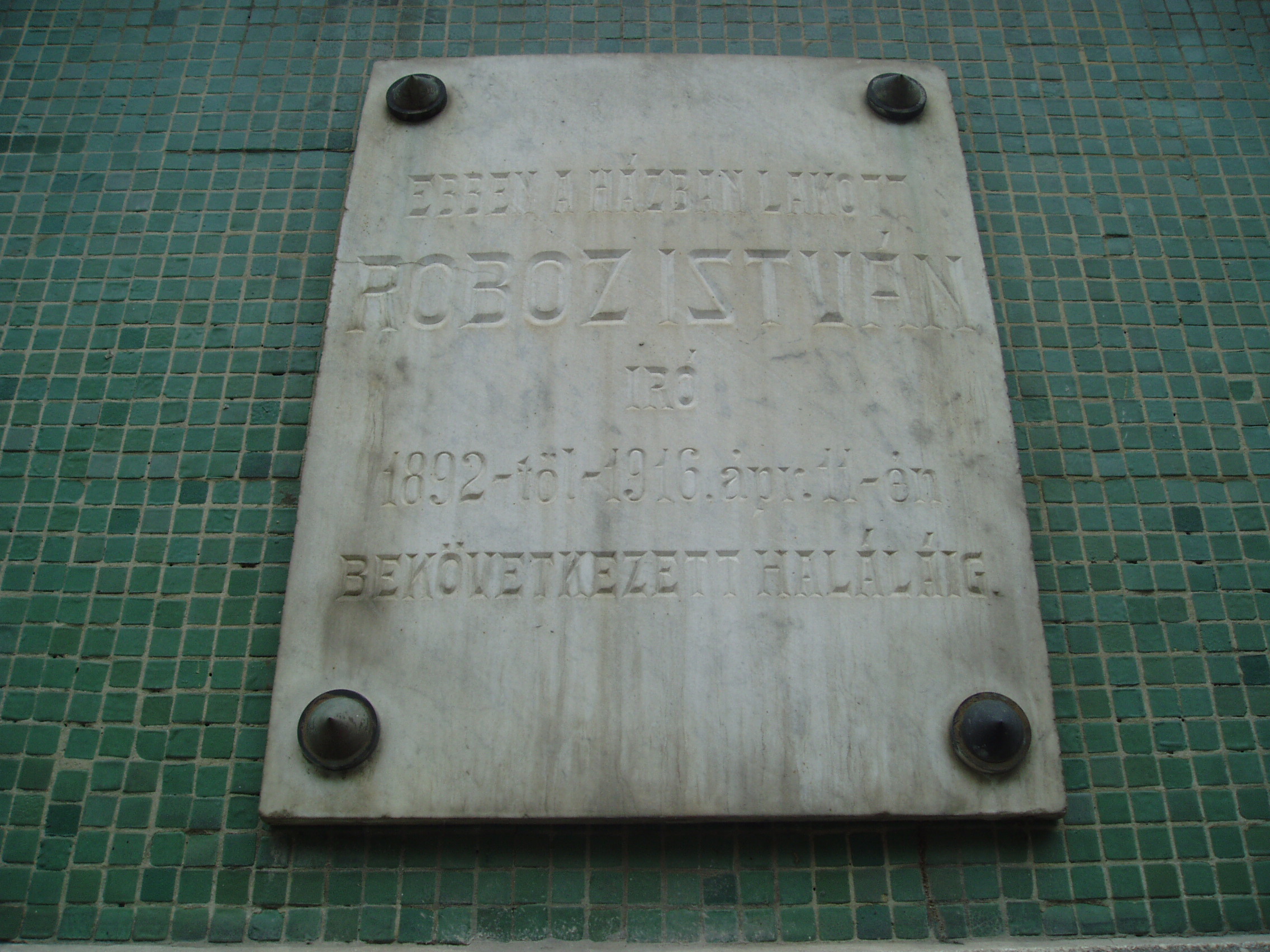 Nyilvános 1476 | 2451 | Kaposvár, Dózsa utca 16. | A korábban ezen a helyen állott házban lakott 1892-től 1916-ban bekövetkezett haláláig Roboz István író, szerkesztő. Halála után az eredeti épületet emléktáblával jelölték meg, amelyet 1996-ban áthelyeztek az itt felépített új épületre, egy kiegészítő szöveges táblával együtt. Roboz István (Kötcse, 1828. okt. 26. - Kaposvár, 1916. ápr. 11.): költő, író, újságíró. Pápán Petőfi és Jókai iskolatársa volt. Diákéveit "Petőfi Sándor és az én pápai emlékeim" című, forrásértékű visszaemlékezéseiben örökítette meg. A szabadságharc alatt kormánybiztosi titkár Kaposvárott. Végleg 1856-ban telepedett le a városban, ahol először törvényszéki bíróként, később főjegyzőként dolgozott. Nagy aktivitással kapcsolódott be a dél-dunántúli irodalmi életbe. 1866-ban megalapította a Somogy című lapot, amelyet haláláig szerkesztett. Elnöke volt a Somogy vármegyei Berzsenyi Társaságnak. Ő írta - a hagyomány szerint az ádándi kastélyban - 1849-ben a később több nyelvre is lefordított "Kossuth imája a kápolnai csatában elesettek felett" című verset, amelyet a helyszínen felolvasott Wesselényi Miklósnak és Kemény Zsigmondnak. Az ima az 1850-es években a legismertebb hazafias fohász volt. A fénykép 2006 márciusában készült. Felh. irod.: Életrajzi lexikon www.adand.hu |