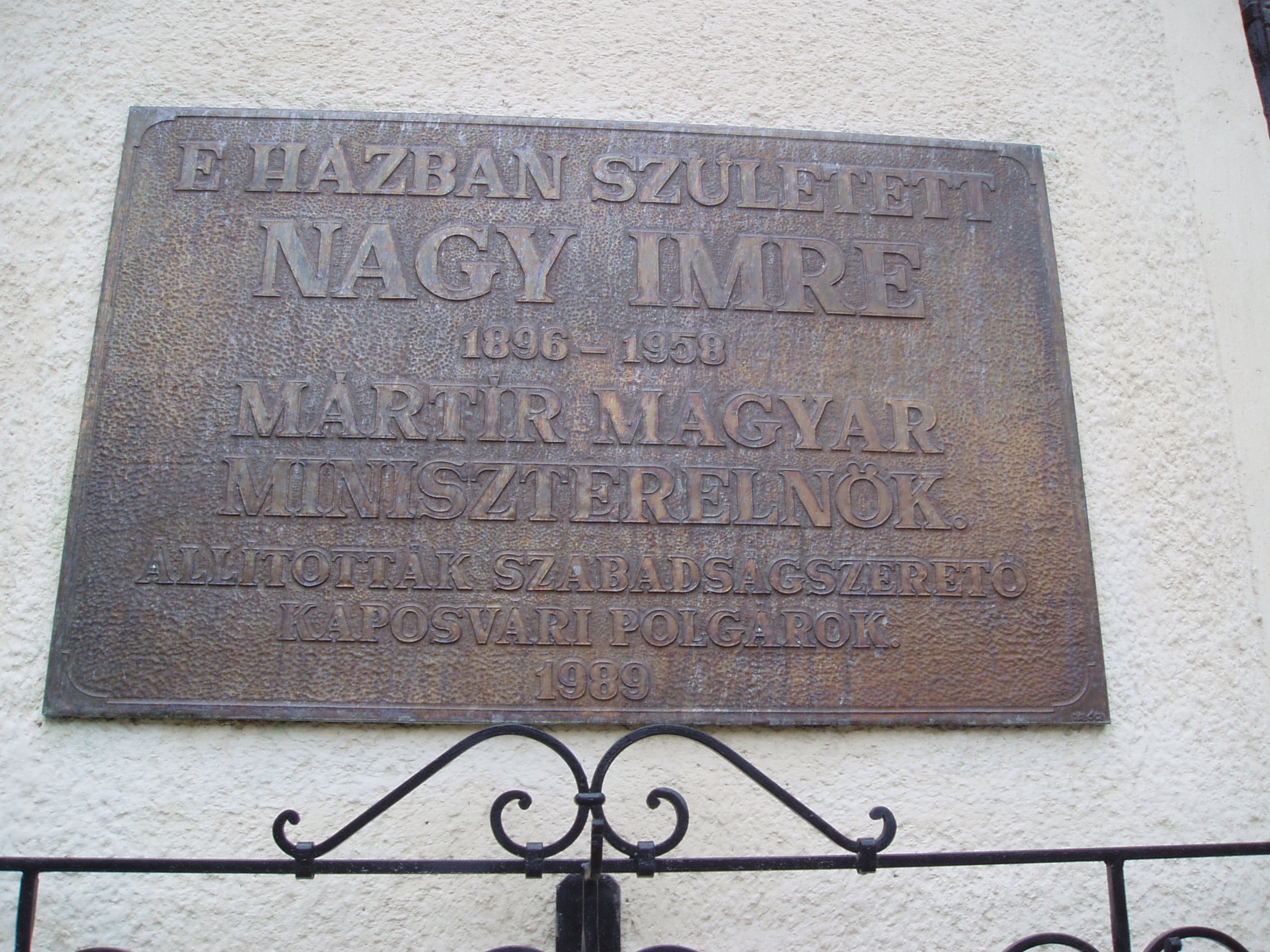 Nyilvános 925 | 1692 | Kaposvár, Fő utca 77. | Kaposvár hosszú főutcájának a városközponttól távolabbi részén ma is álló kis házban született Nagy Imre mártír miniszterelnök 1896. június 7-én. Emléktábláját 1989-ben, rehabilitálásának évében helyezték el. 1996-ban, a forradalom 40. évfordulójára szobrot is állítottak emlékére a Megyeháza előtt, az 56-os emlékmű mellett (Paulkovics István alkotása). Nagy Imre református szegényparaszti családból származott. Apja postai szerelőmunkás volt. Anyja, mielőtt férjhez ment volna, a somogyi alispánnál cselédlányként szolgált. Tanulmányait a 4 elemi (lásd: Kaposár, Fő u. 44.) és a 4 polgári osztályig végezte, mert 1912-ben saját elhatározásból elhagyta kaposvári gimnáziumot és géplakatos segédnek állt. A segédi oklevelet 1914-ben szerzete meg, majd a tanulmányait folytatandó beiratkozott a kaposvári felső kereskedelmi iskolába. Ezt már nem tudta elvégezni, mert 1915 májusában behívták katonának. A Monarchia katonájaként 1918-ban az orosz fronton fogságba esett. Politikai pályafutása ekkoriban kezdődött el. A fénykép 2006 márciusában készült. Felh. irod.: Látnivalók Somogy megyében. Miskolc, Well-PRess, 2000 hu.wikipedia.org/wiki/Nagy Imre |