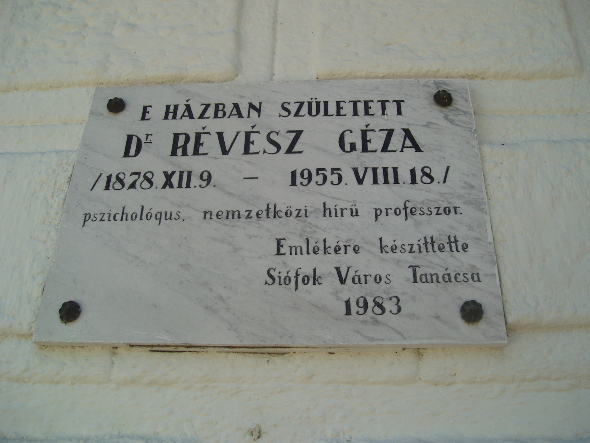 Nyilvános 1483 | 2332 | Siófok, Bajcsy-Zsilinszky utca 48. | 1878. december 9-én ebben a házban született Révész Géza pszichológus, nemzetközi hírű professzor. Elsősorban zenepszichológiával és hangfiziológiával foglalkozott. 1919-ben emigrált. 1921-től Amszterdamban működött, mint az ottani kísérleti lélektani intézet igazgatója. 1932-1950 között az amszterdami egyetemen a lélektan tanára volt. 1949-től a bajor tudományos akadémia tagja. A würzburgi egyetem díszdoktorává avatta. Amszterdamban hunyt el 1955. augusztus 18-án. A fénykép 2006 júliusában készült. Felh. irod.: Magyar életrajzi lexikon |