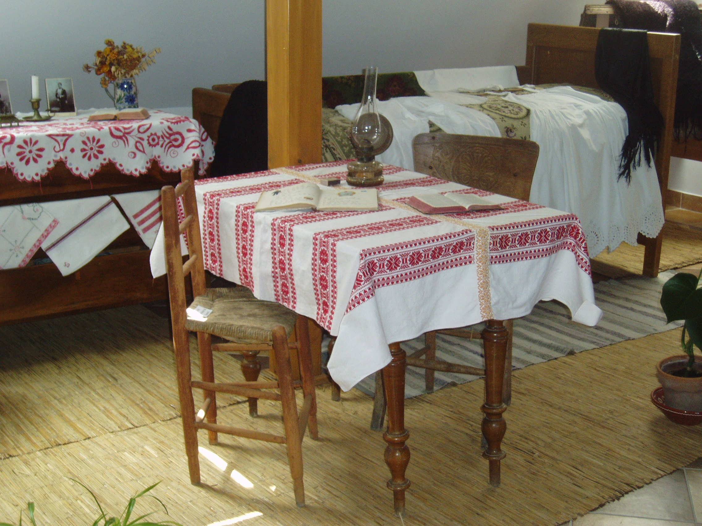 Nyilvános 914 | 1604 | Fonyód, Bartók Béla utca 3. Természetvédelmi és Helytörténeti Múzeum | A fonyódi Várhegyen kialakult Bélatelephez tartozó, a Balaton egyik legszebb panorámájú helyén álló villát az orvosi doktorátussal rendelkező, többek között Kelet-kutatóként is számon tartott lászlófalvi Velics Antal (1875-1915) építtette az 1900-as évek elején. Ebben a villában töltötte 1916 és 1917 nyarát Szinyei Merse Pál, hazánk egyik legkiválóbb festőművésze. Balatoni tartózkodása idején hozzávetőleg tíz fetményt alkotott. Az épület az 1980-as évek végéig moziként üzemelt. Felújítása után, 2004-ben nyílt meg termeiben a fonyódi Természetvédelmi és Helytörténeti Múzeum. Benne a Fonyód történetét és néprajzát bemutató állandó kiállítás mellett időszaki kiállításokat is rendeznek. A képen a néprajzi kiállításrész látható. A fénykép 2007 júliusában készült. Felh. irod.: http://muzeum.fonyod.hu/ |