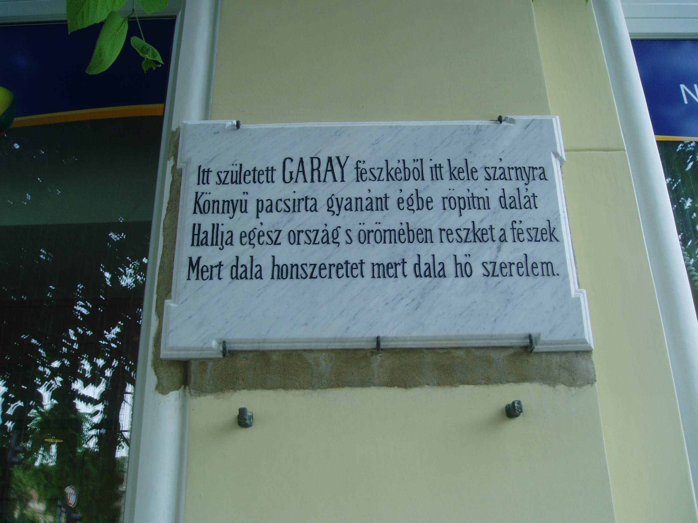 Nyilvános 896 | 1447 | Szekszárd, Széchenyi utca 40. Diczenty-ház | A mostani városi bérpalota, a XIX. század végén eklektikus stílusban épült ún. Diczenty-ház helyén állott az a földszintes sarokház, amelyben Garay János költő született. 1881-ben még az eredeti házon helyezték el a költő emléktábláját, amelyet aztán áttettek a helyére épült Diczenty-házra. Ma viszont az eredeti táblának már csak egy másolata látható, csak Szász Károly verssorai ugyanazok... Az 1812. október 12-én született Garay János apja kereskedő, árvaszéki teendőkkel megbízott, köztiszteletben álló szekszárdi polgár volt. Anyja, Valter Ilona tizenkét gyermeknek adott életet. A szekszárdi gyermekkor meghatározóvá vált a költő számára. Házukban otthonos volt az új magyar irodalom, és Garayban hamarosan mutatkozott a költői hajlam. Legismertebb műve, Háry Jánosról szóló elbeszélő költeménye is szekszárdi élményből született. A fénykép 2006 júliusában készült. Felh. irod.: www.csatolna.hu/hu/korbejart/garay.shtml Hegedűs Géza: A magyar irodalom arcképcsarnoka. Bp. Trezor, 1993 |